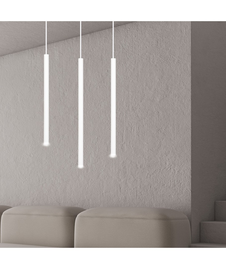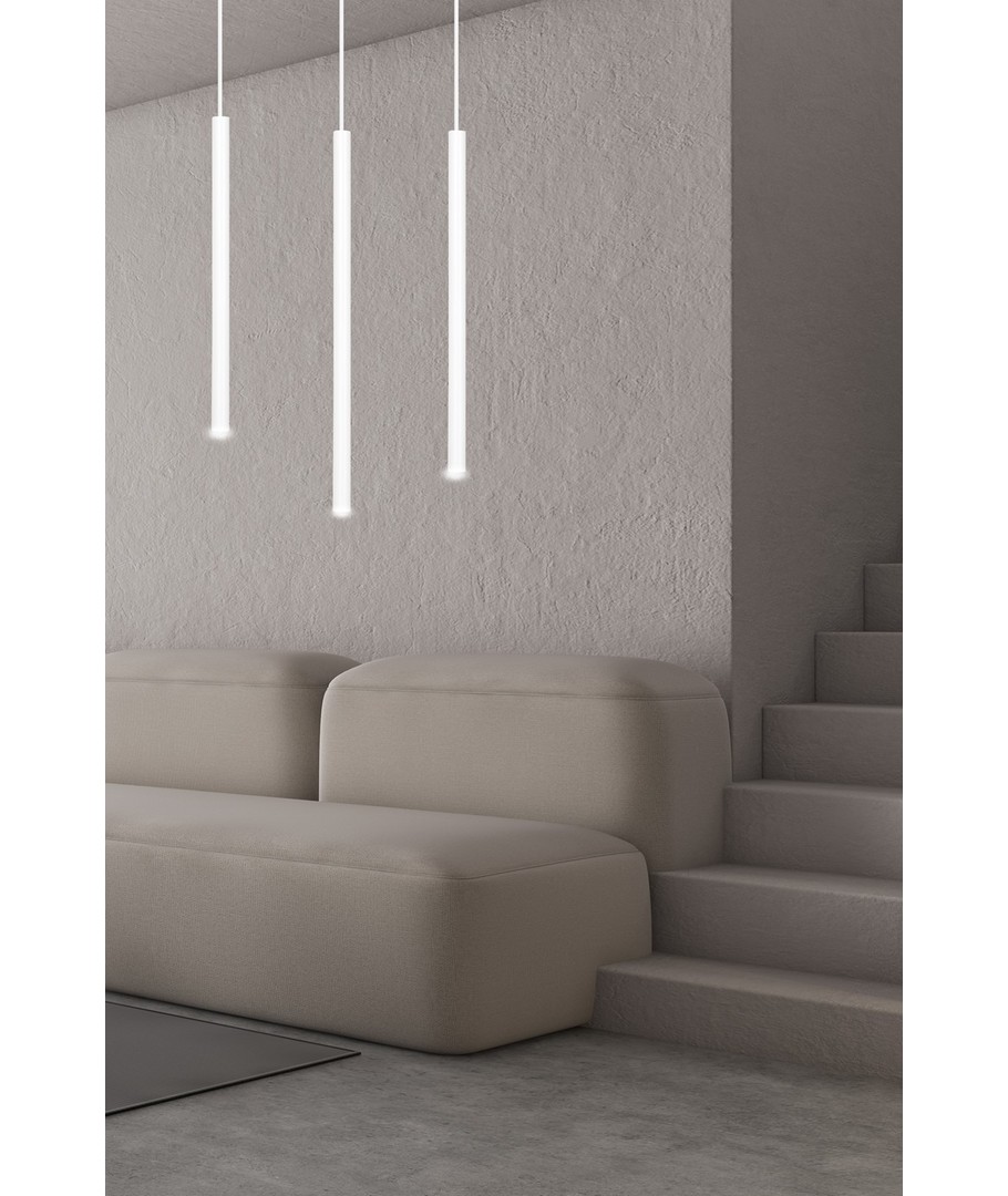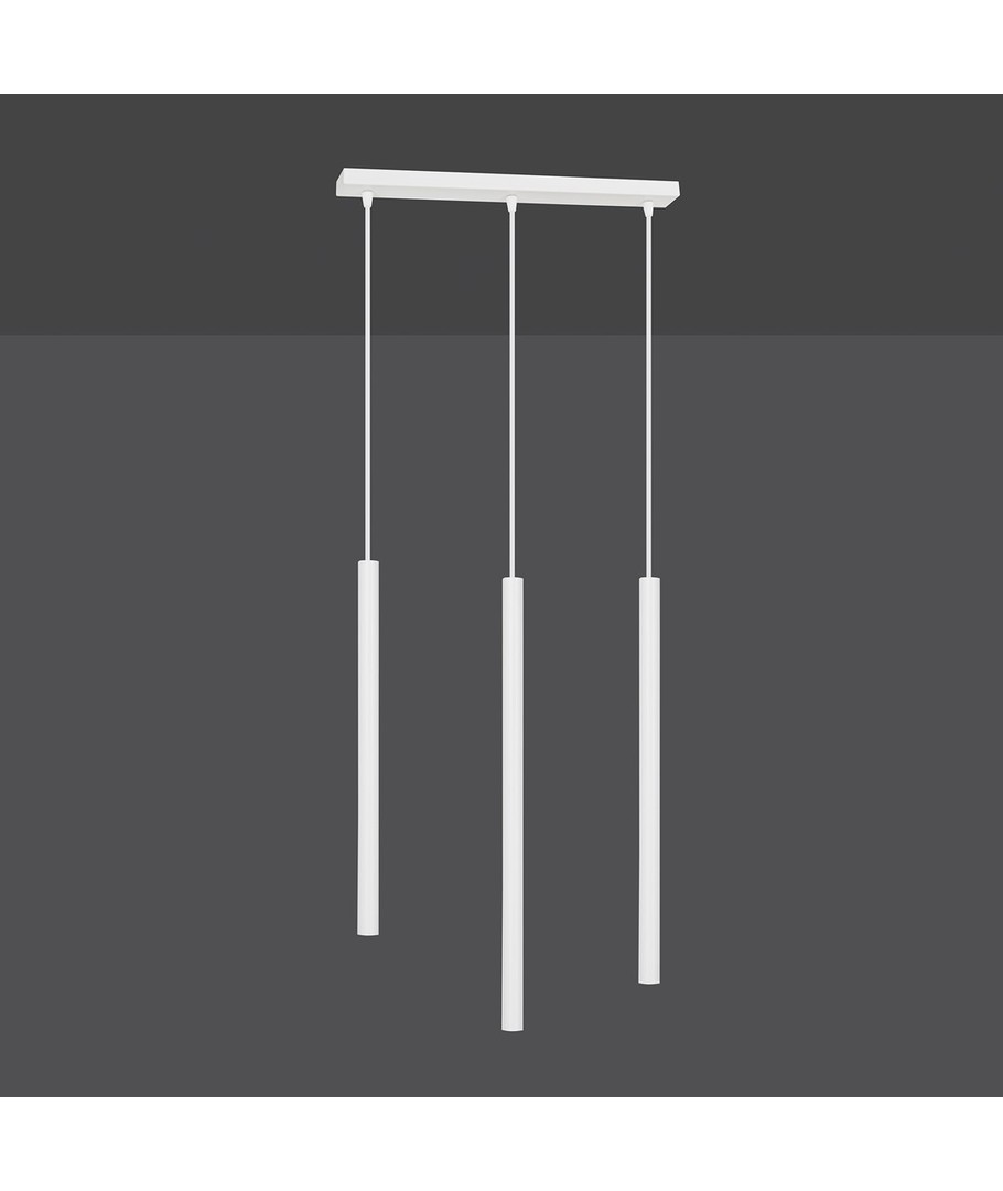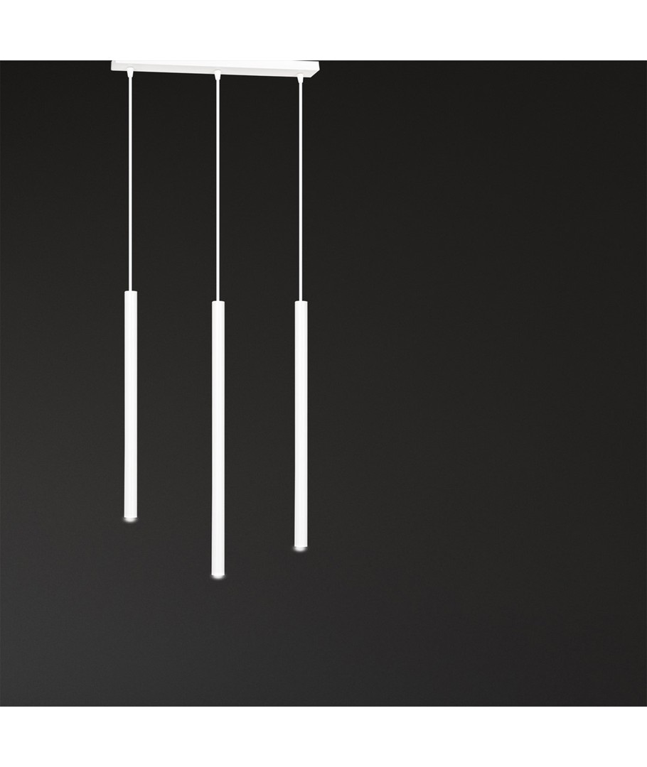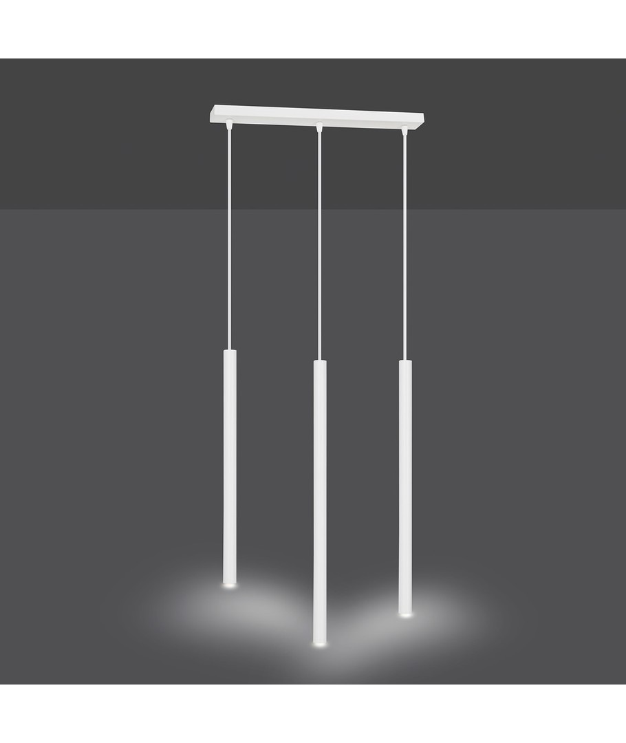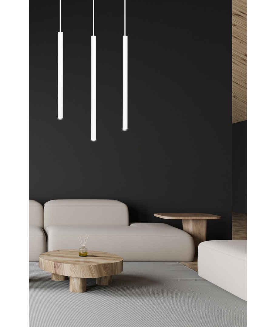 Selter 3 Hvit pendellampe er en ultramoderne belysningsløsning som imponerer med sitt slanke og elegante design. Denne taklampen er utstyrt med lange metallblader, noe som gir et lett og originalt uttrykk. Selter-serien henvender seg til dem som søker utradisjonelle løsninger med en moderne og markant stil. Lampen er ideell for å tilføre en sofistikert touch til både stuer og spisestuer, hvor stil og funksjonalitet møtes.