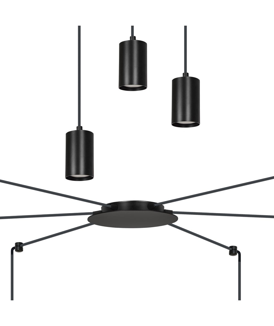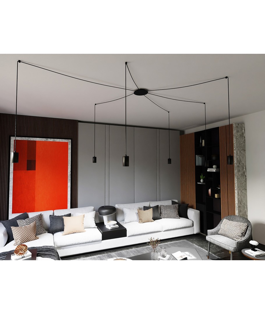 Traker 6/Sort pendellampen er et elegant og moderne valg til ditt hjem eller kontor. Designet som en spindelvev-type taklampe, utnytter den lange ledninger til å skape mange kreative oppsett. Denne lampen er ideell for høye takrom, hvor den vakkert fremhever rommet og gir en imponerende belysning. Den stilfulle svarte fargen og de metalrør i pulverlakkert stål bidrar til et enkelt, men originalt design, som passer perfekt inn i moderne interiør.