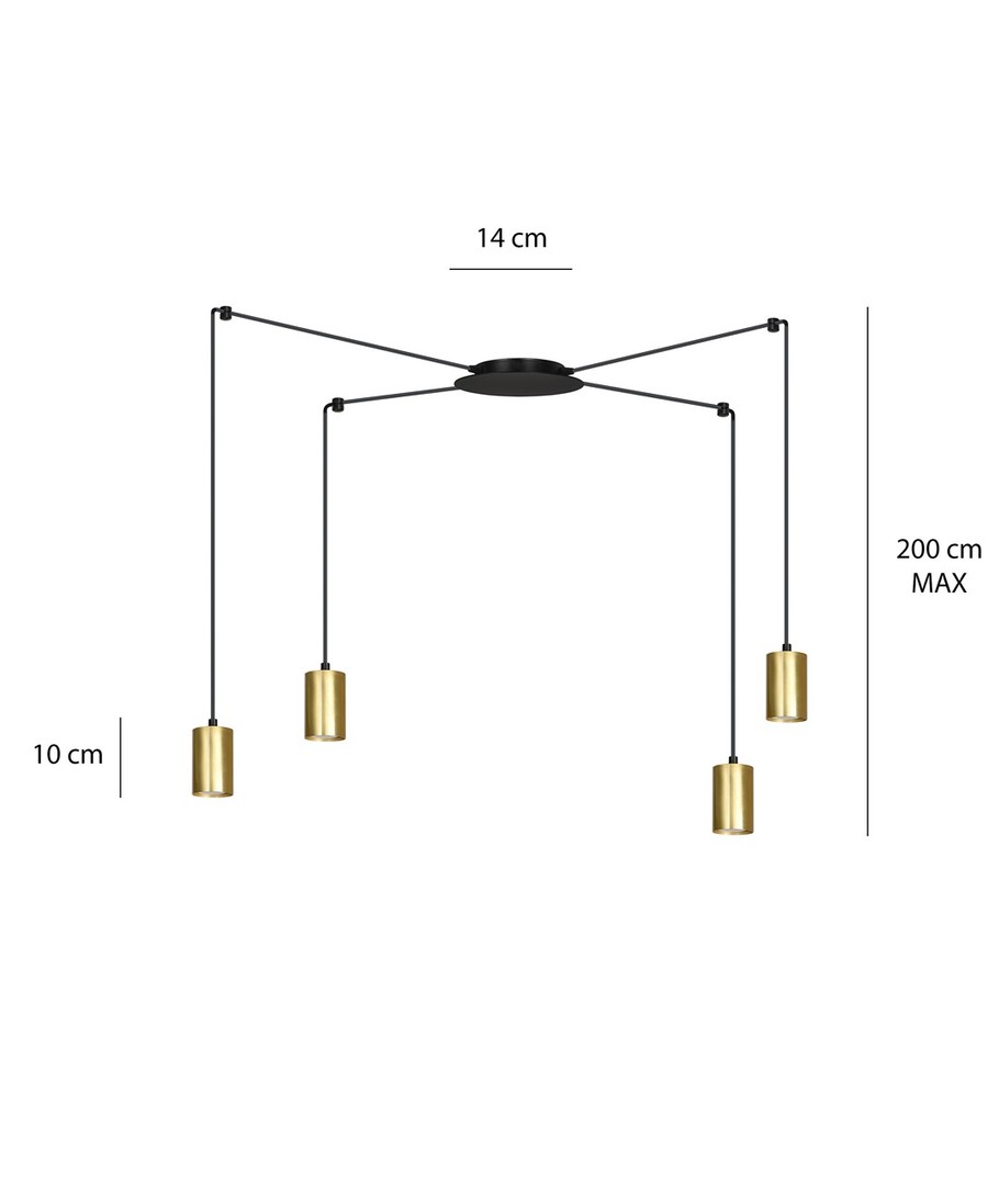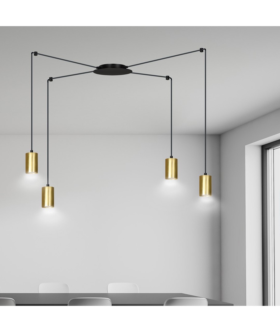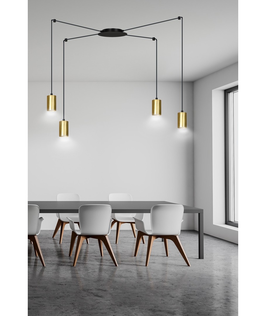 Traker 4 Sort/Gull pendellampen er en bemerkelsesverdig taklampe som kombinerer funksjonalitet med et stilfullt design. Dens edderkopplignende struktur gjør den ideell for høye takrom, hvor de lange ledningene kan arrangeres på mange måter. Lampens sort- og gullfargede metallrør tilfører et moderne touch som fremhever rommets karakter og skaper en fengslende belysning. Den enkle, men originale utførelsen gjør Traker-lampen til det perfekte valget for dem som verdsetter både design og funksjonalitet i deres innredning.