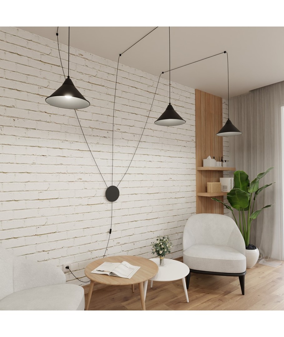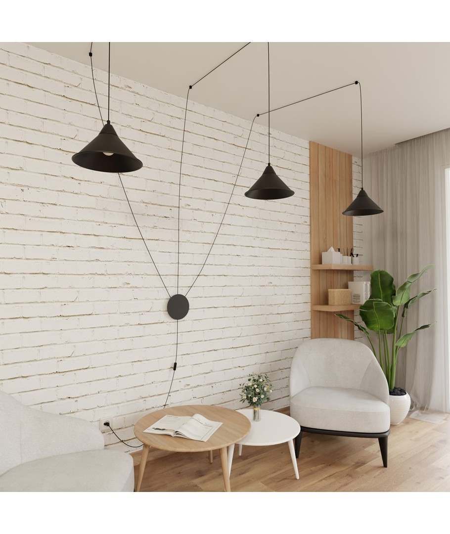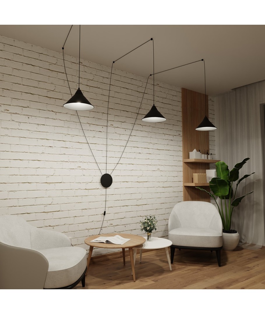 Abramo 3 Sort pendellampe er en del av den eksepsjonelle ABRAMO-serien, som leverer et allsidig design, perfekt for enhver innredning. Med sitt moderne utseende tilpasser denne lampen seg lett til forskjellige innredningsstiler. Den kan monteres på veggen, og med den lange ledningen tilbyr ABRAMO utallige innredningsmuligheter. Funksjonaliteten kombinert med et unikt design skaper en harmonisk dekorasjon som gleder øyet.