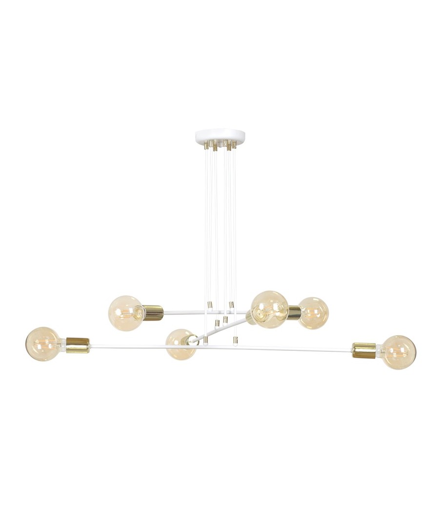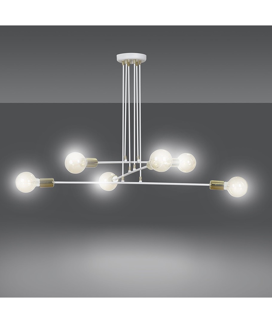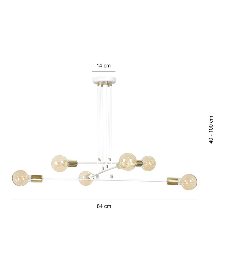 Vesio 6 hvit pendellampe er den perfekte kombinasjon av minimalisme og eleganse. Den er designet for høye takrom med sin unike og luftige konstruksjon. Med sine seks sokler og gyldne detaljer tilfører den et snev av luksus til ethvert rom, samtidig som den sikrer optimal belysning. Lampens industrielle design er ideelt for å skape en moderne og stilfull atmosfære i hjemmet. Den justerbare høyden gjør det enkelt å tilpasse lampen til forskjellige romhøyder, noe som gjør den både praktisk og allsidig.