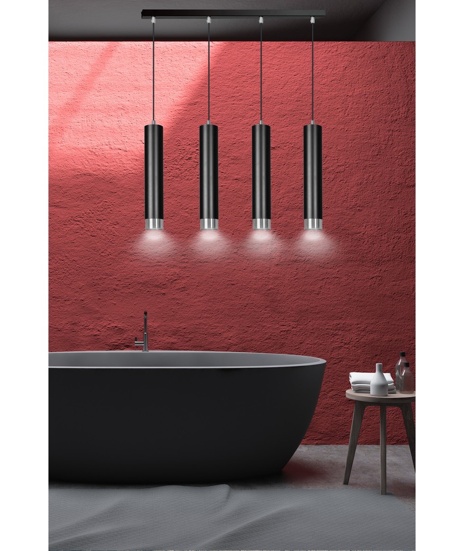 Kibo 4 Sort/Krom pendellampe kombinerer moderne design med funksjonalitet, hvilket skaper en stilfull belysningsløsning for ditt hjem. Med sitt slanke, rørformede design og elegante sorte farge med kromdetaljer, passer lampen perfekt inn i både moderne og klassiske interiører. Den er ideell for bruk i stuen, kjøkkenet eller hjemmekontoret og tilfører et sofistikert preg til ethvert rom. Bygget i slitesterkt pulverlakkert stål, sikrer Kibo-lampen en lang levetid og en tidløs stil.