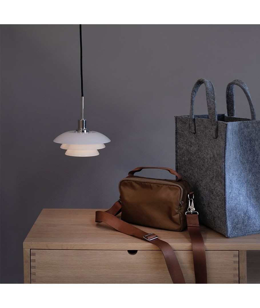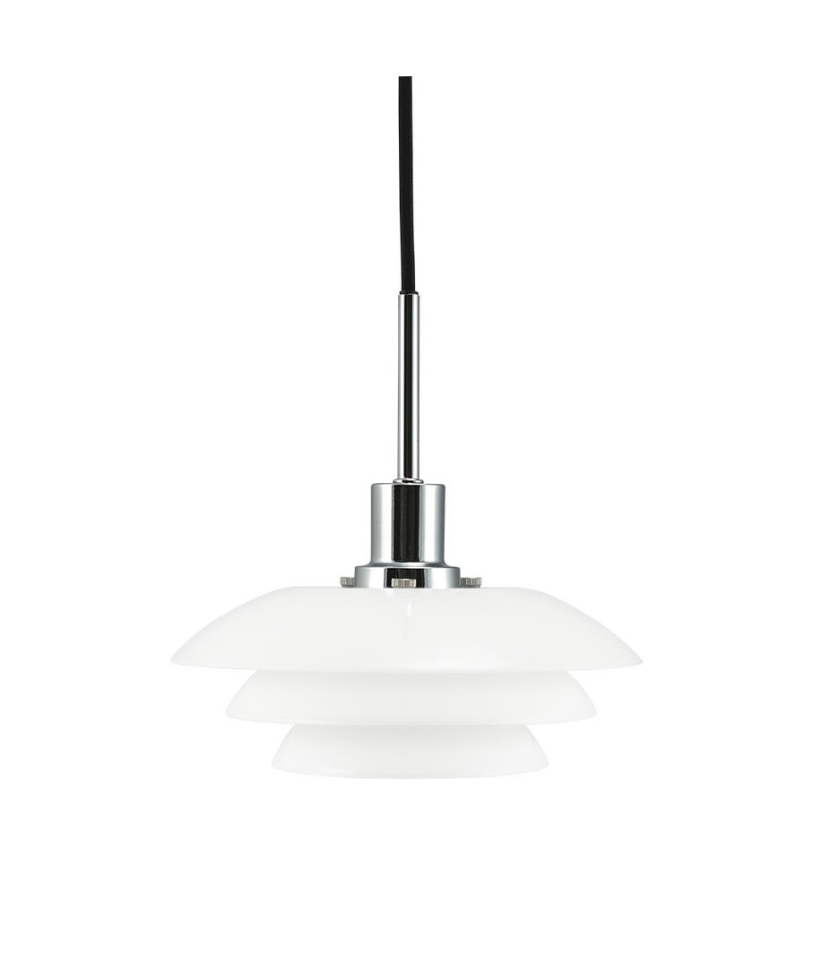DL20 Opal Pendel med krom/metall sokkel, er en vakker lampe som er meget elegant over spisebordet eller kjøkkenbordet. Gir god effekt med 2 lamper ved siden av hverandre. Lyset ledes vakkert gjennom de 3 forskjellige størrelsene på skjermene, og gir en koselig atmosfære i rommet. På grunn av plasseringen av skjermene blender ikke lyset, men skaper i stedet en koselig atmosfære. Anhenget leveres med 3m sort stoffsnor.