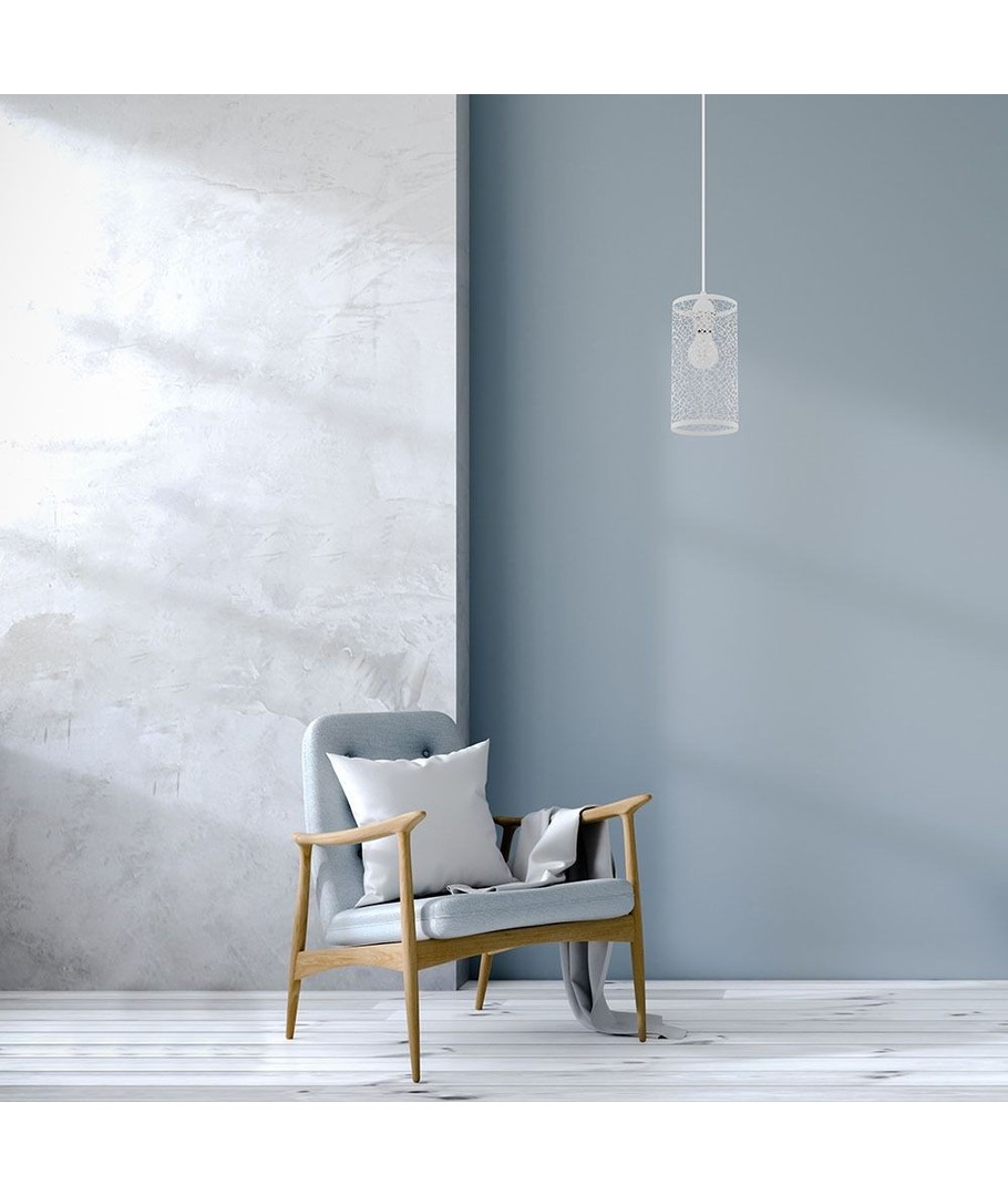 Super vakker pendellampe i matt hvit med mønster. Mønsteret i lampen skaper mange fine skygger når de er tent.