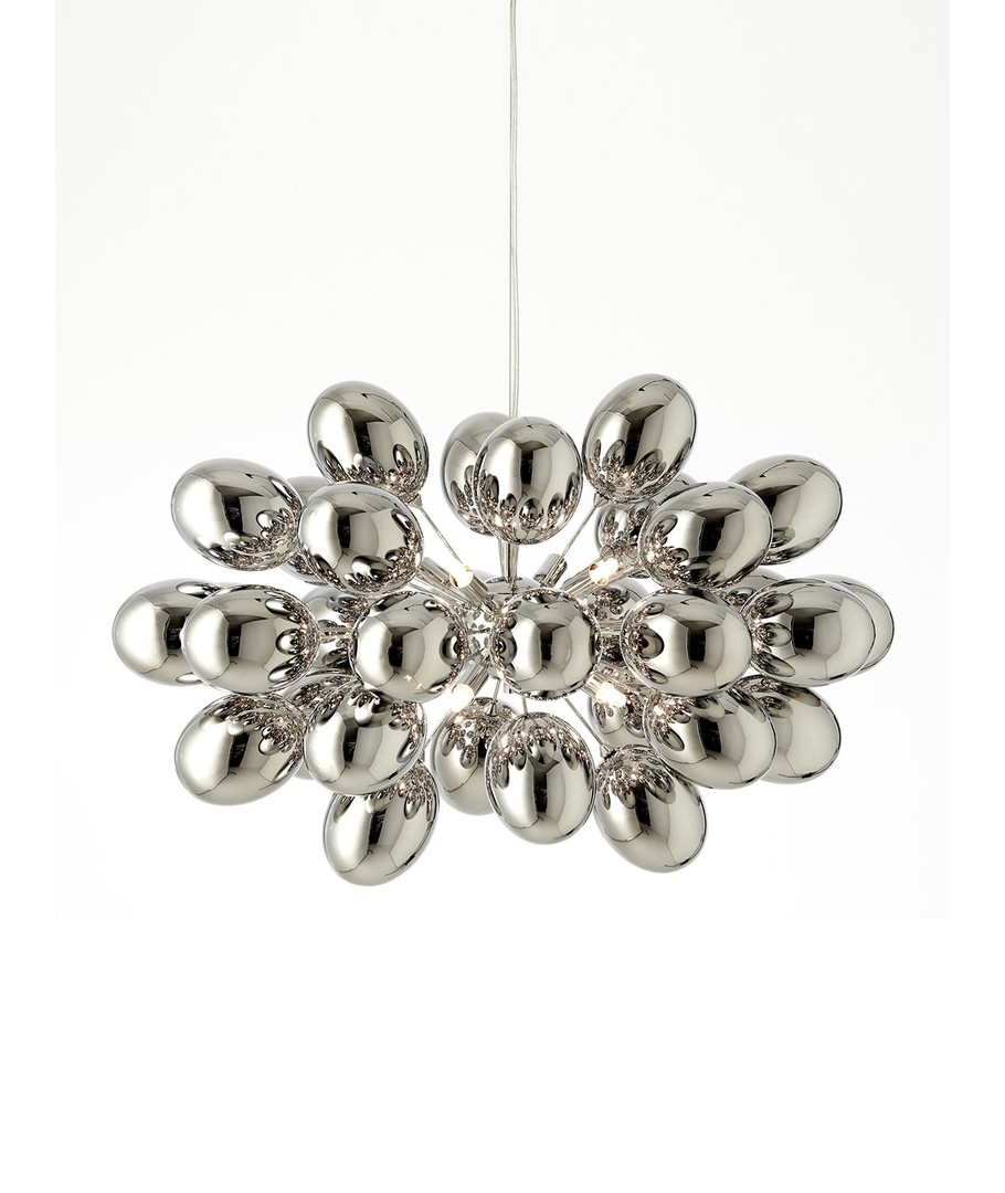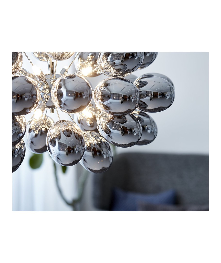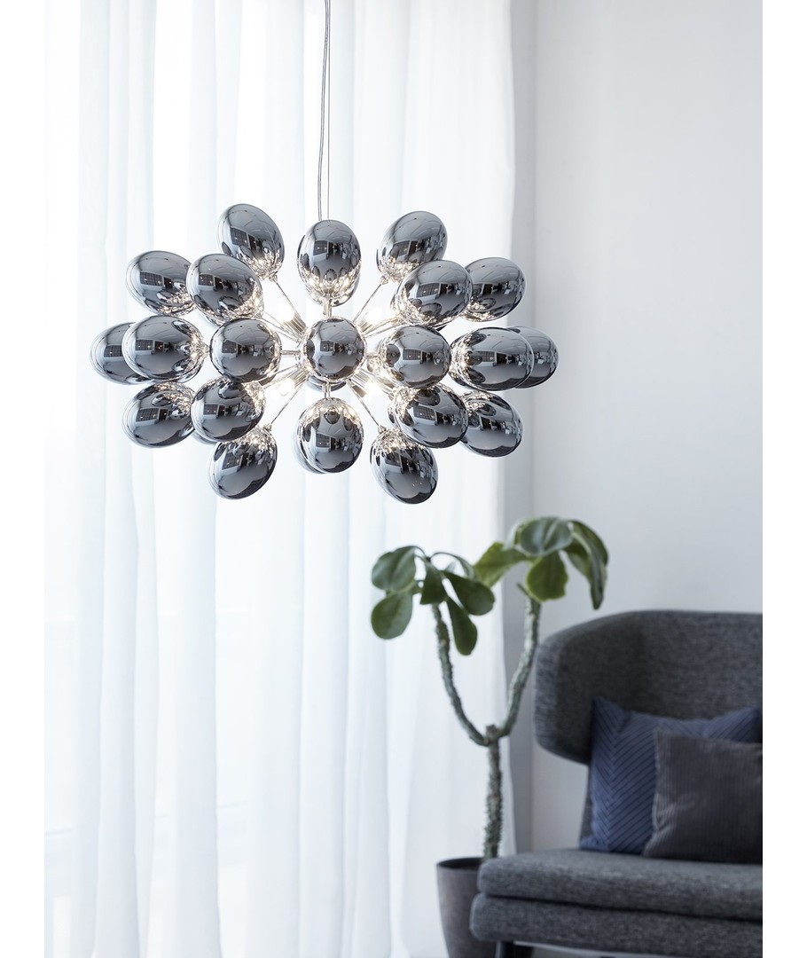 Elegant Pendel lampe med 32 flotte sølv glasskuler fra Nielsen Light. Flott over spisebordet eller i et hjørne. Lampen måler Ø: 74 cm. og en høyde på 50 cm. (total høyde med ledning 402 cm.) Lampen leveres med 8 stk. G9 fatninger.