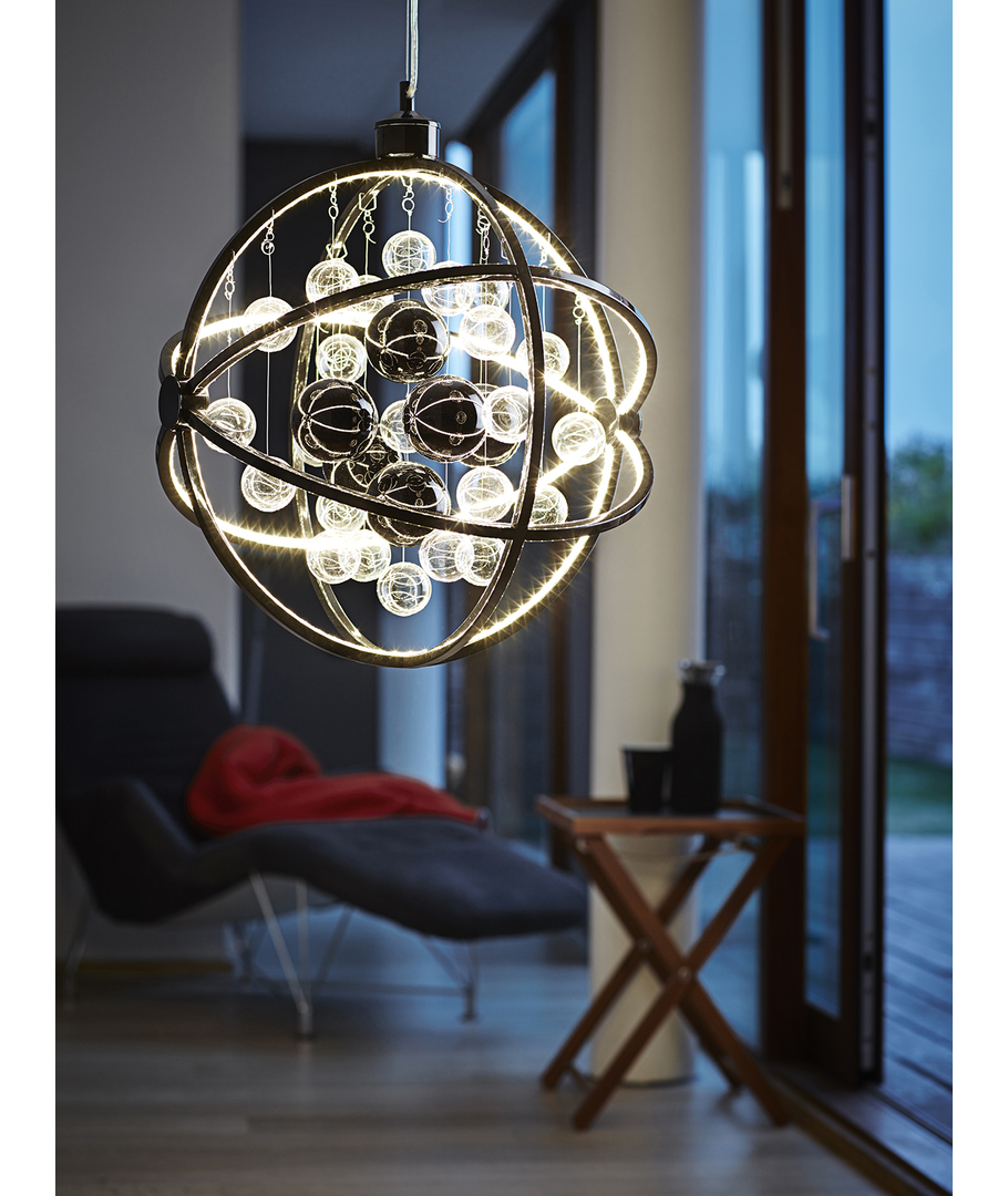 Lampen er montert med LED Strips rundt langs lampen som gjengir lyset i glasskulene ut i rommet. Virkelig en spennende og utrolig flott lampe.