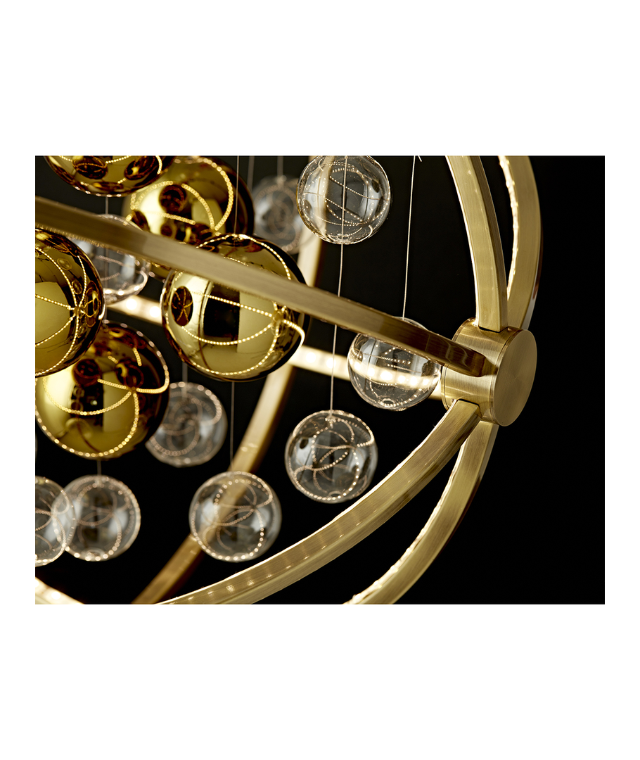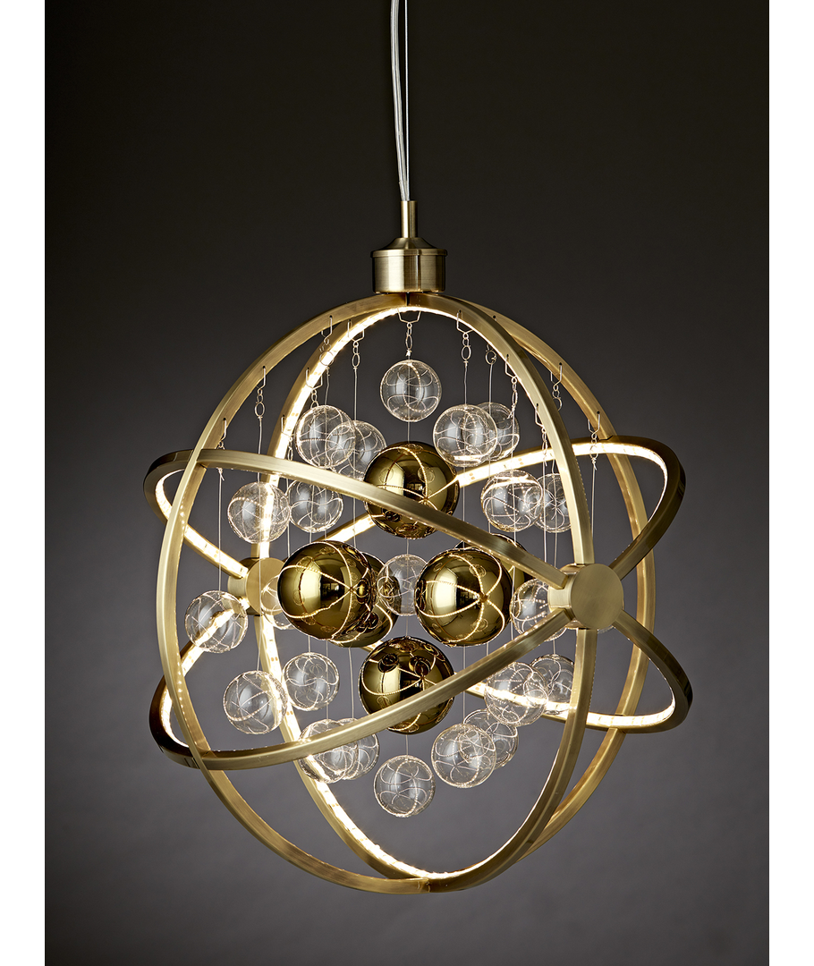 Galaxy Pendel i Antikk Messing - lampen er utført i metall og glass, en annerledes fantastisk flott LED taklampe. Lampen har et futuristisk design og som navnet beskriver, gir det assosiasjoner til galaksen.