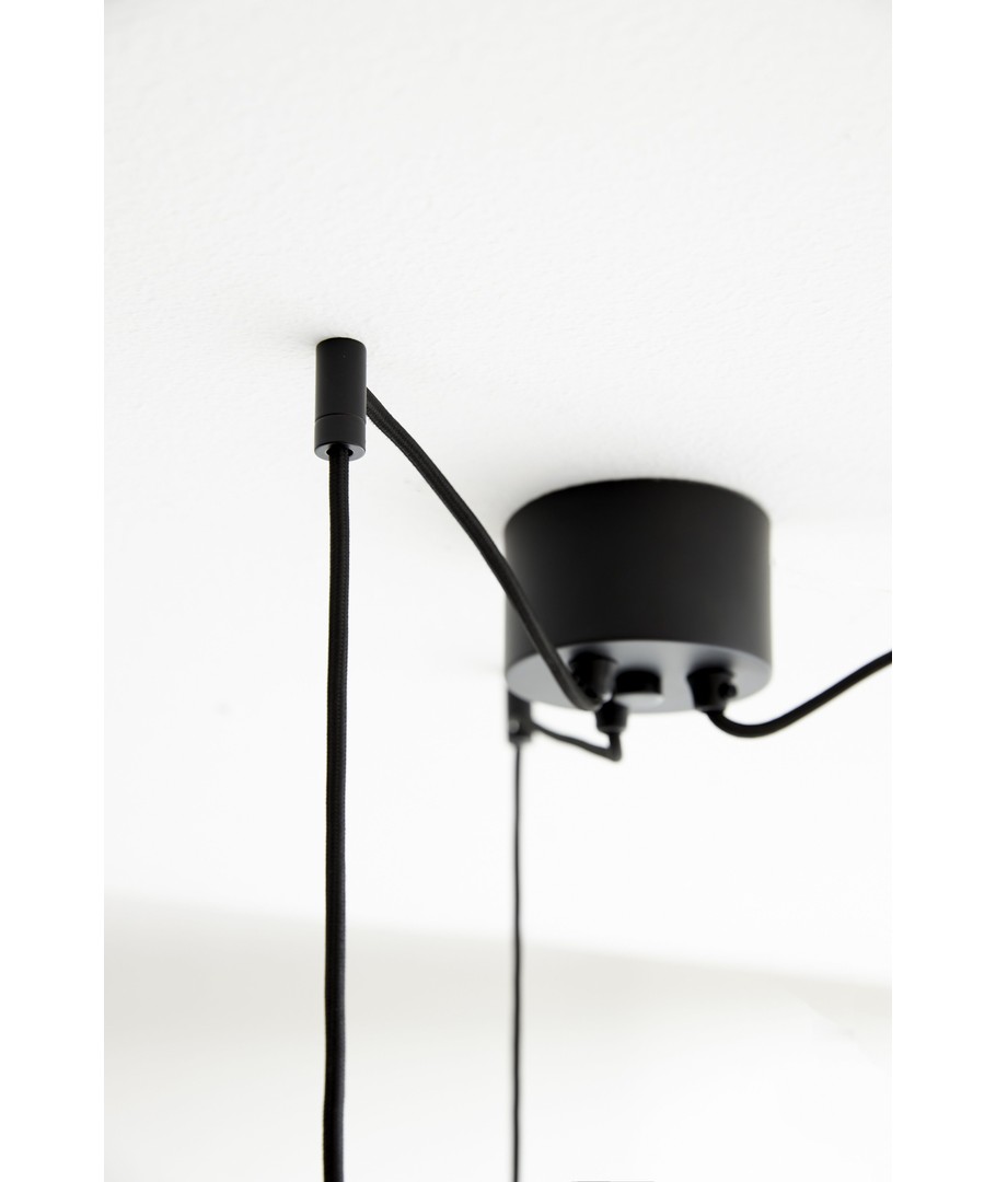 De vakre, svarte stoffledningene på 2,5 meter ledes ut fra baldakinen i valgfri retning og festes i taket med enda et ledd, slik at de 3 forskjellige fatningene kan henge fra taket på akkurat den måten du vil ha.