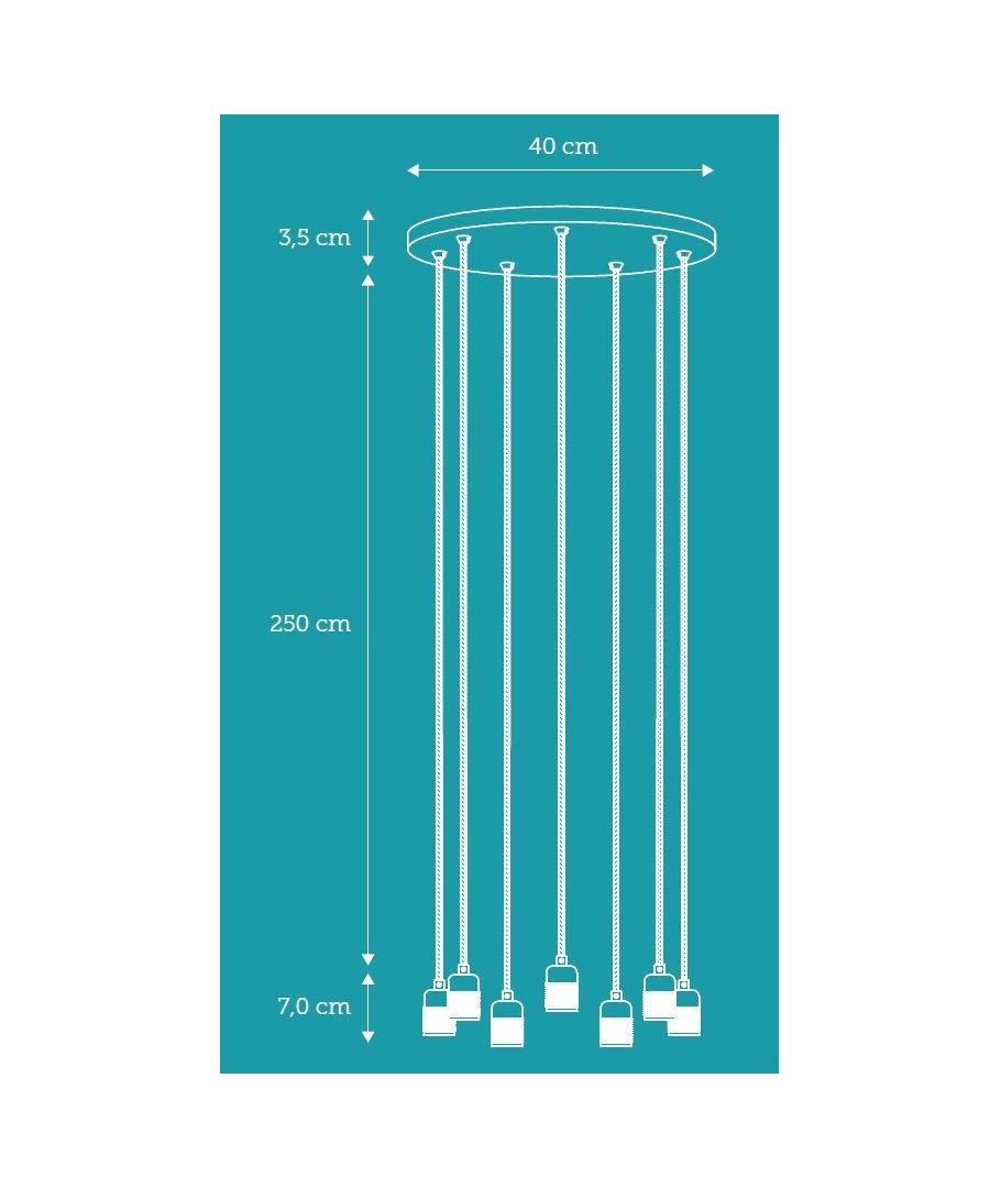 Stoffledningene på 2,5 meter ledes ut fra baldakinen i valgfri retning og festes i taket med enda et ledd, slik at de 7 forskjellige fatningene kan henge fra taket på akkurat den måten du ønsker.