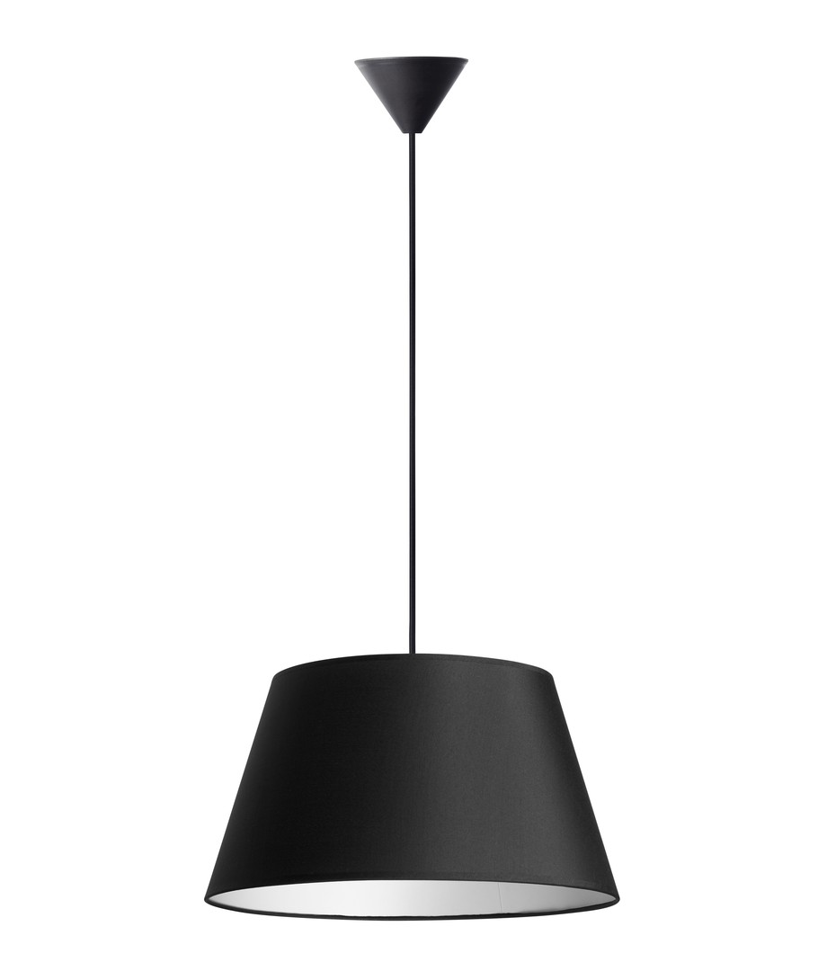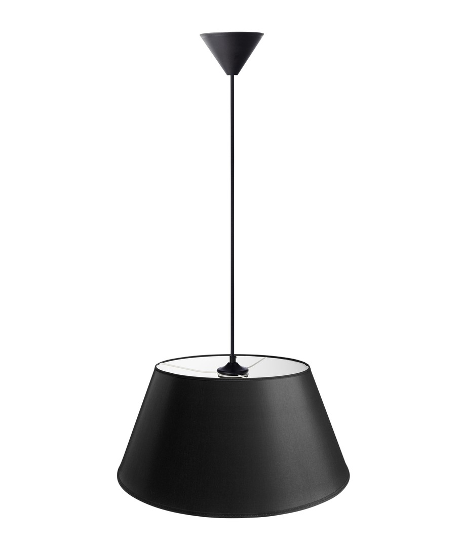 Vakker, kjegleformet pendellampe fra det danske Nielsen Light, som er hvit på innsiden og kledd med svart stoff på utsiden.