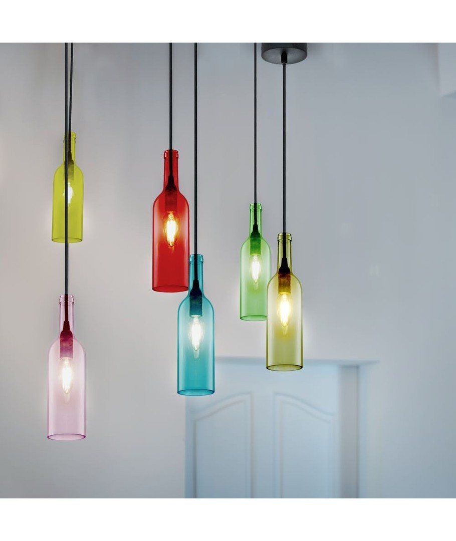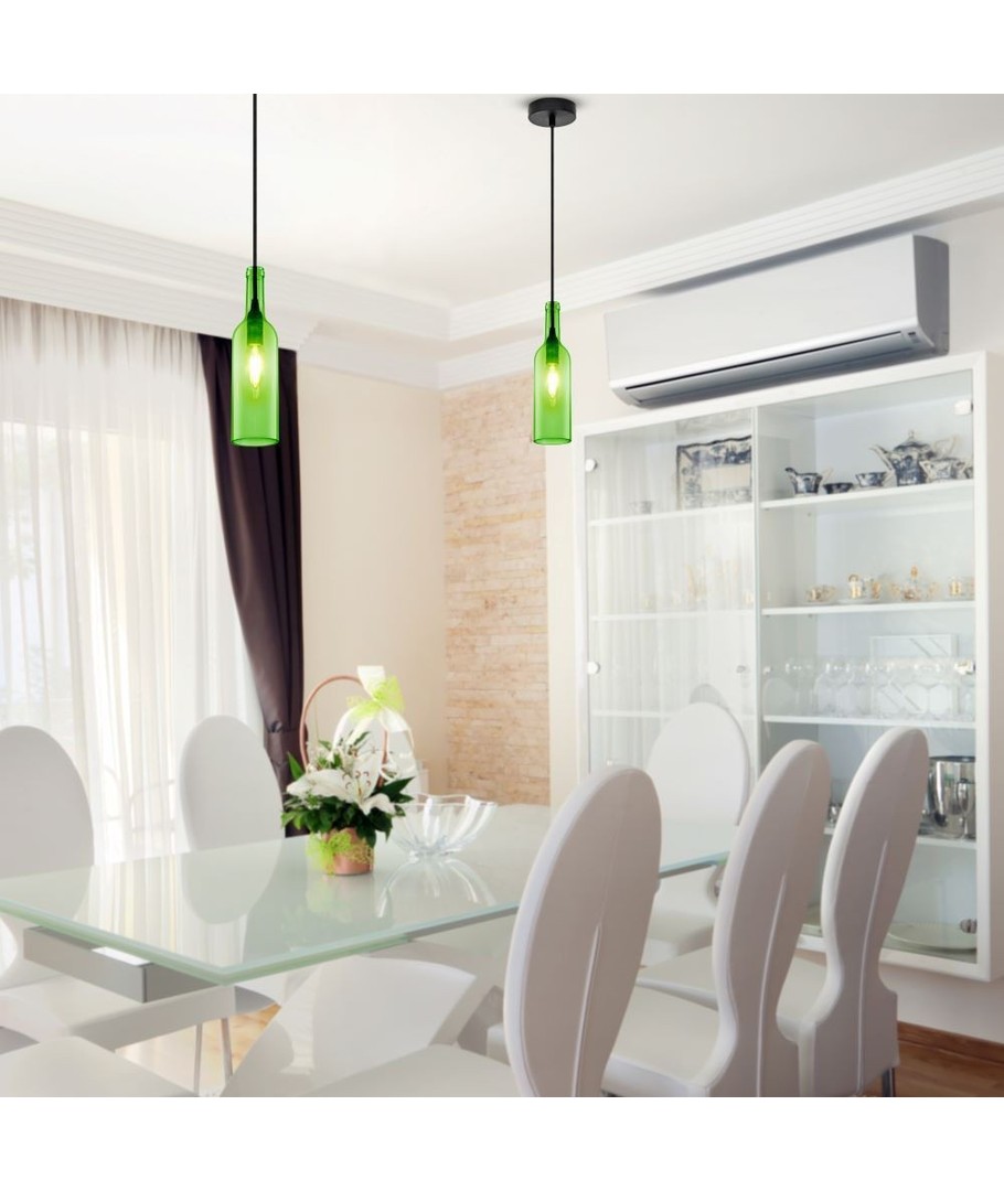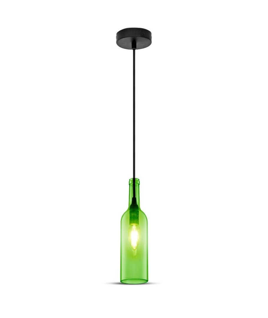 Unik lampe med grøn glassflaske som gir en fin effekt når lyset er på.