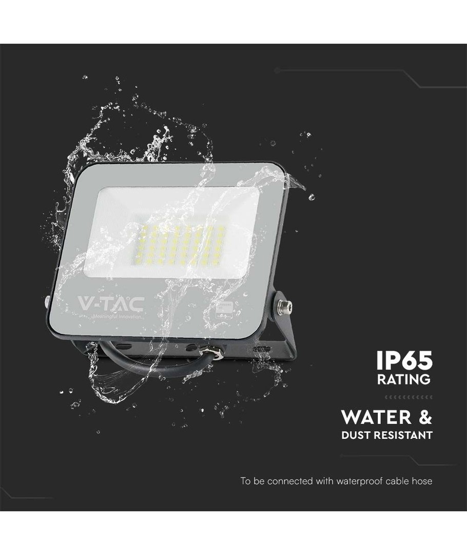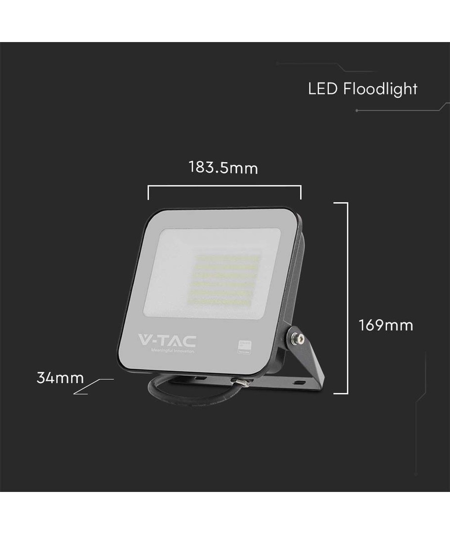 V-Tac 50W LED lyskaster er bygget for å tåle krevende utendørsforhold med en IP65-sertifisering. Dette gjør den motstandsdyktig mot vannsprut og regn, slik at den kan brukes utendørs uten bekymringer. Med dimensjoner på 169 x 183,5 x 34 mm er den kompakt, men effektiv.
