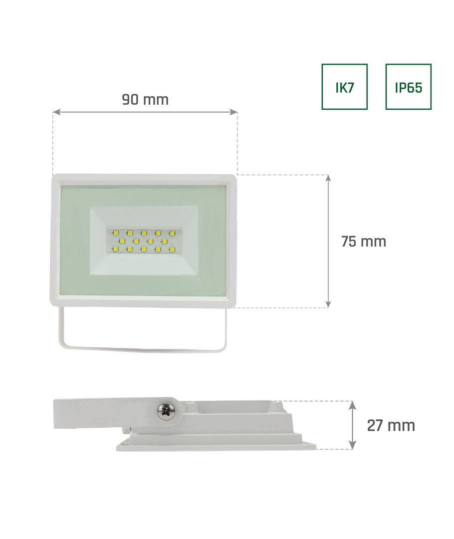 Med dimensjoner på 90 x 75 x 27 mm er lyskasteren enkel å montere, samtidig som den gir en stilren fremtoning. Produktet har IP65-klassifisering, hvilket betyr at det er motstandsdyktig mot vannsprut og regn, og derfor godt egnet for utendørs bruk.