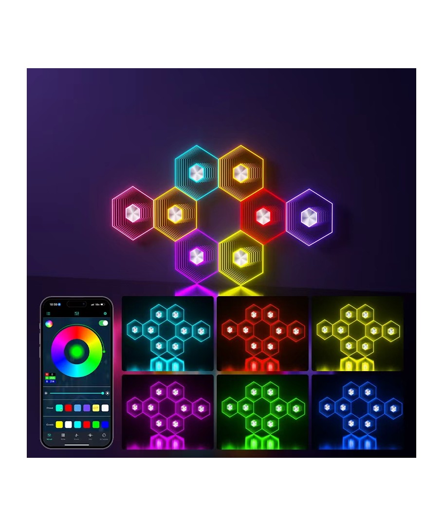 RGBIC Hexagon Infinity Vegglamper er en fantastisk måte å diversifisere og forbedre belysningsoppsettet ditt på, med tilpasningsmuligheter som passer til dine estetiske preferanser og belysningsbehov. La kreativiteten din flomme ved å arrangere disse lampene i ulike formasjoner for et personlig uttrykk.