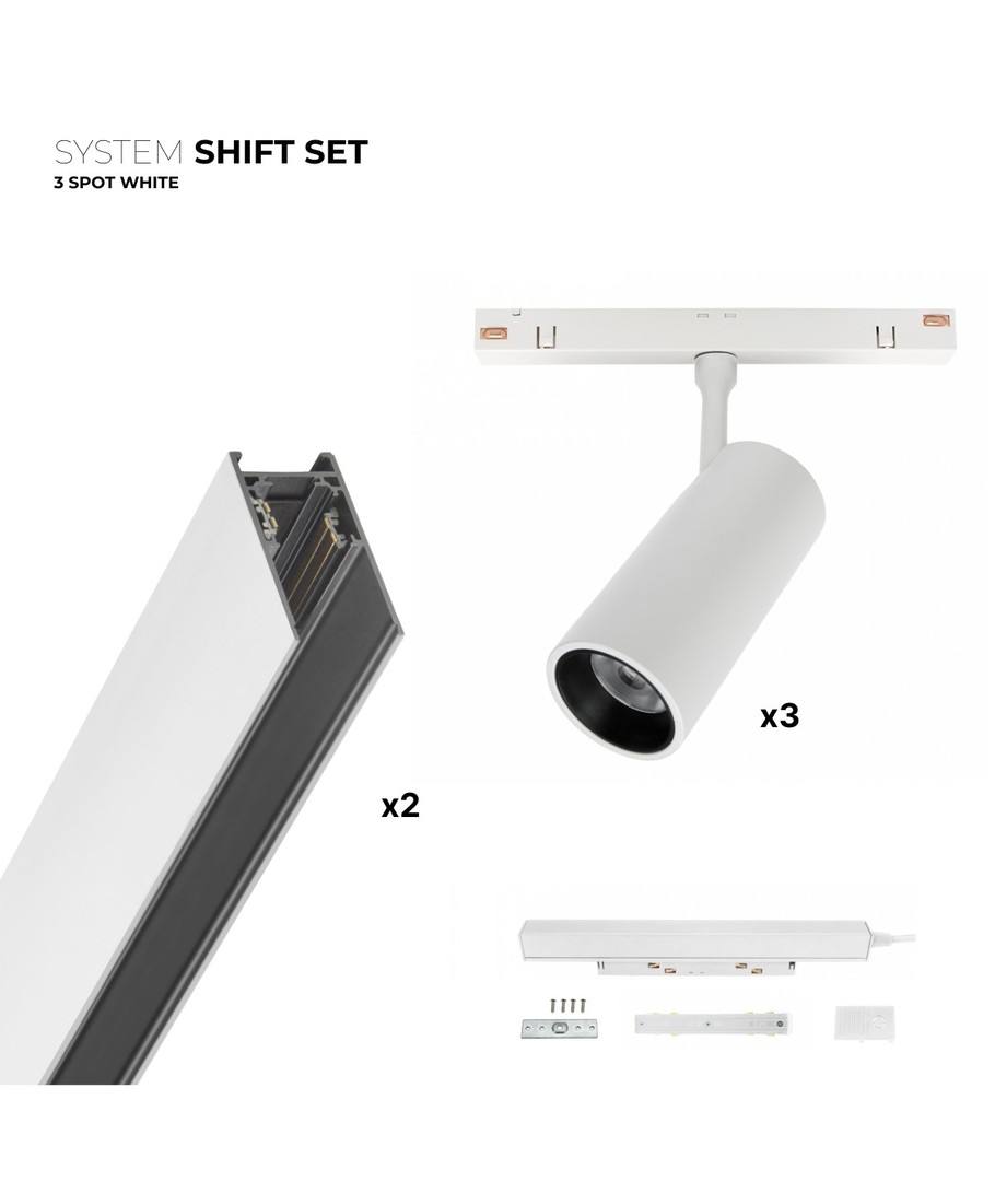 Med SHIFT 3x spot settet får du 2x 1 meter skinner og 3x LED spots, samt alt du trenger for å installere det.