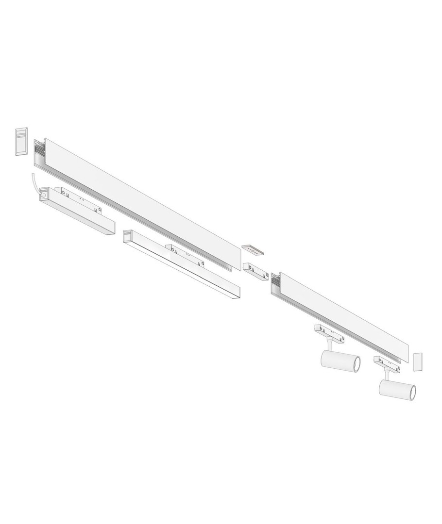 I dette SHIFT-settet får du 2x 1 meter skinner, 2 LED-spotter og en lysskinne, samt alt du trenger for å installere settet.