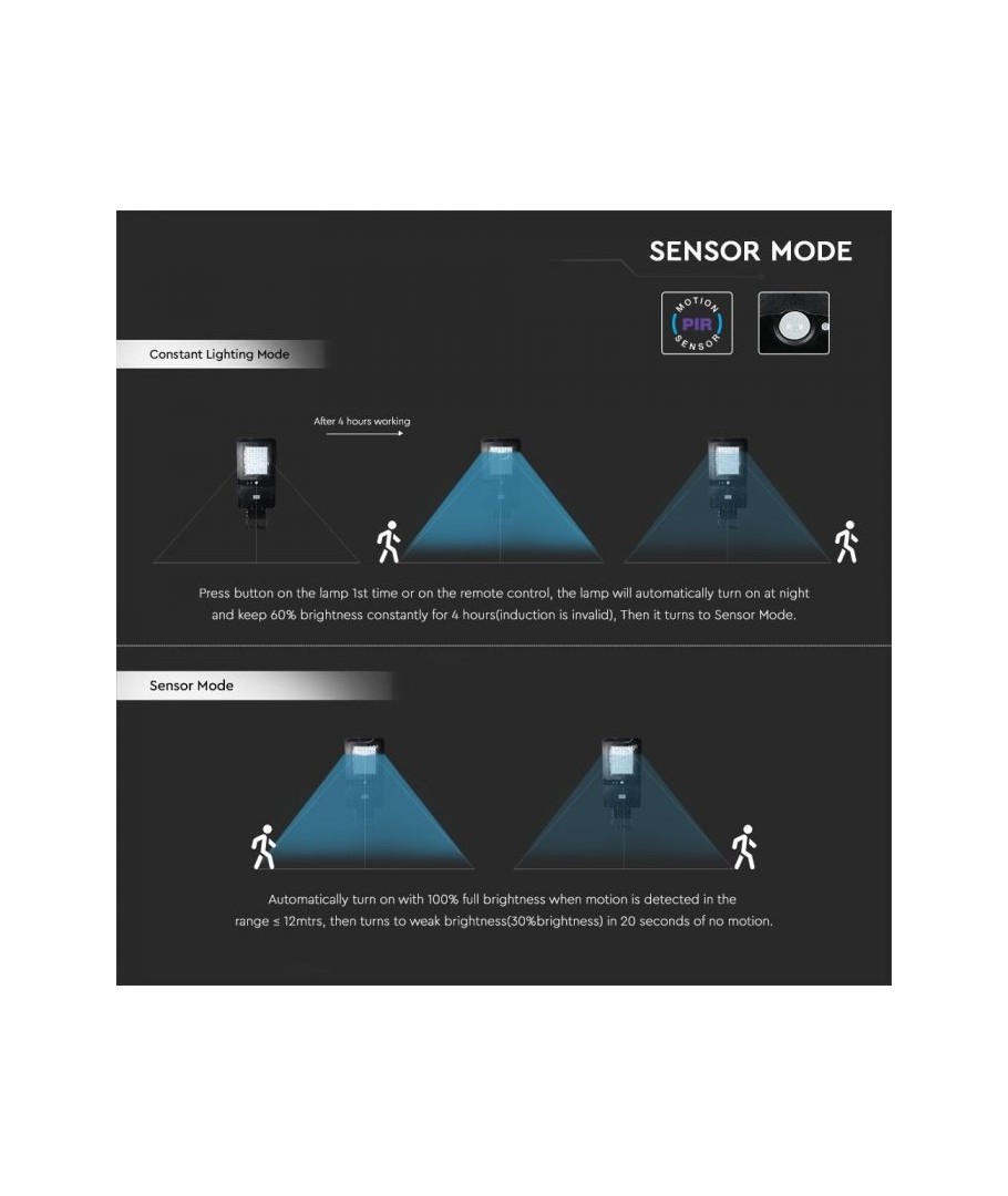 Designet for å gi belysning uten behov for strøm, er denne lampen perfekt for utendørsområder. Med sin IP65-klassifisering er den vanntett og holdbar i alle værforhold. Den har en sensor som aktiveres i en rekkevidde på 8-12 meter, noe som gjør den ideell for å oppdage bevegelse og gi lys når det trengs. Lampen kan fungere i opptil 36-120 timer på bare 8-10 timers ladetid, noe som sikrer langvarig og pålitelig belysning. Velg denne gatelampen for en effektiv og miljøvennlig løsning for utendørsbelysning!