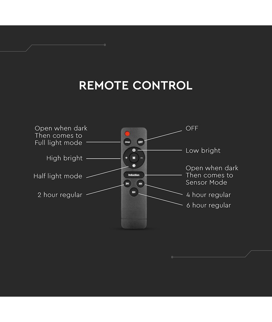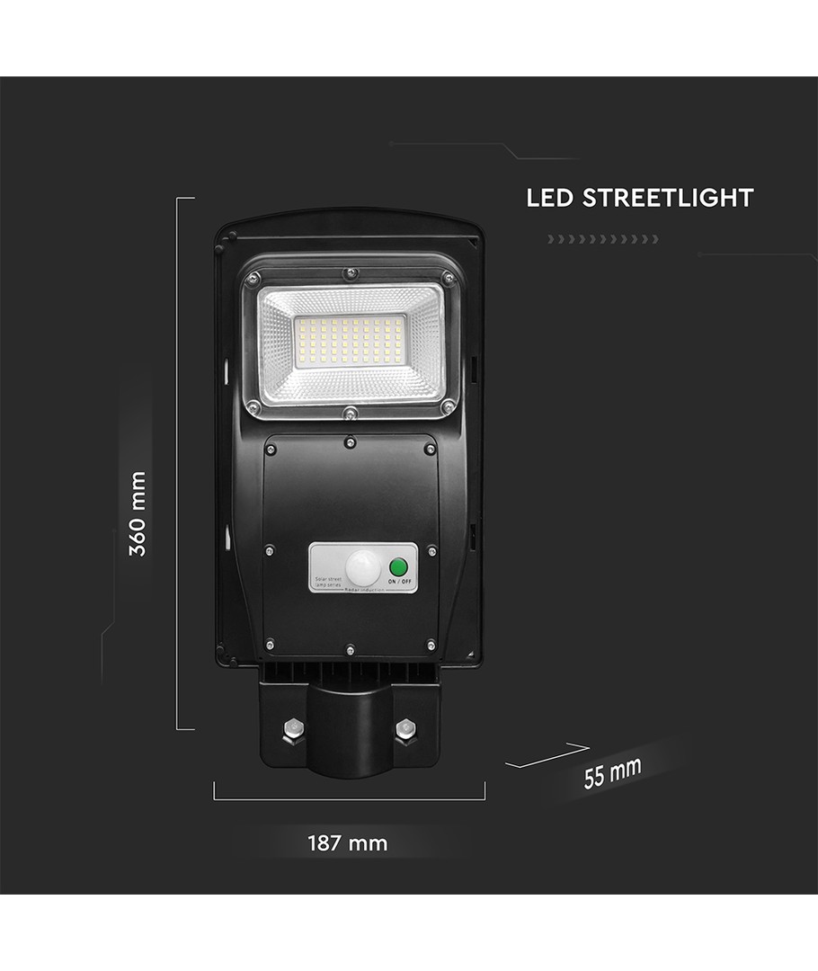 Med dimensjoner på 360 x 55 x 187 mm, passer gatelyset godt i de fleste utendørs innredninger. Det er laget med et svart hus i plast som ikke bare gir et stilfullt utseende, men også holdbarhet mot elementene.