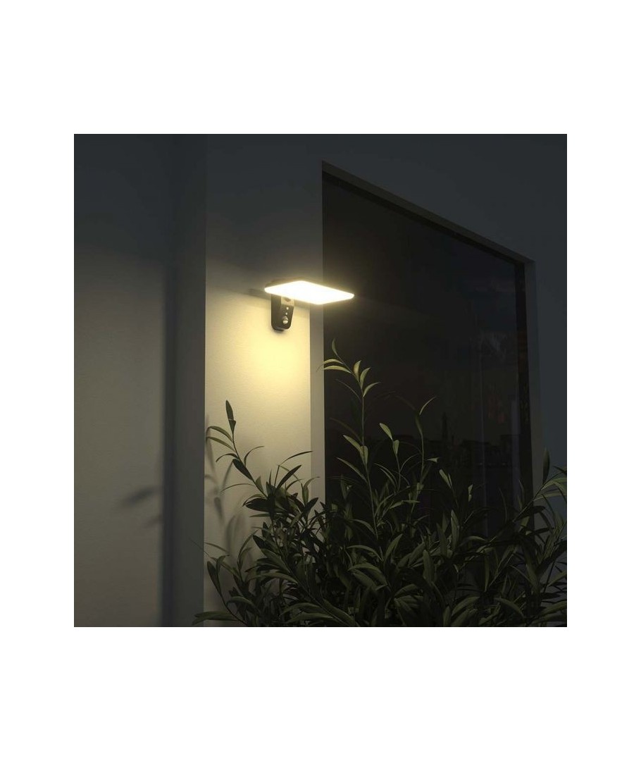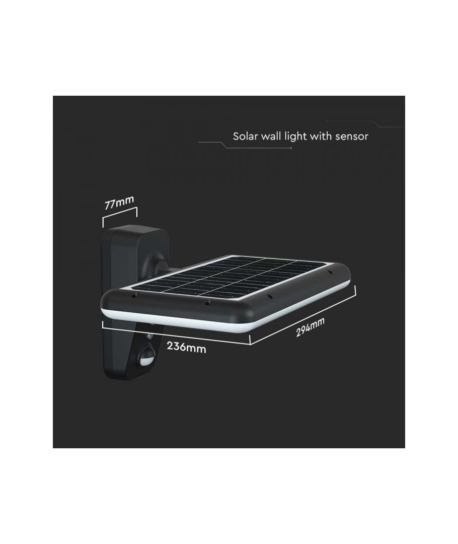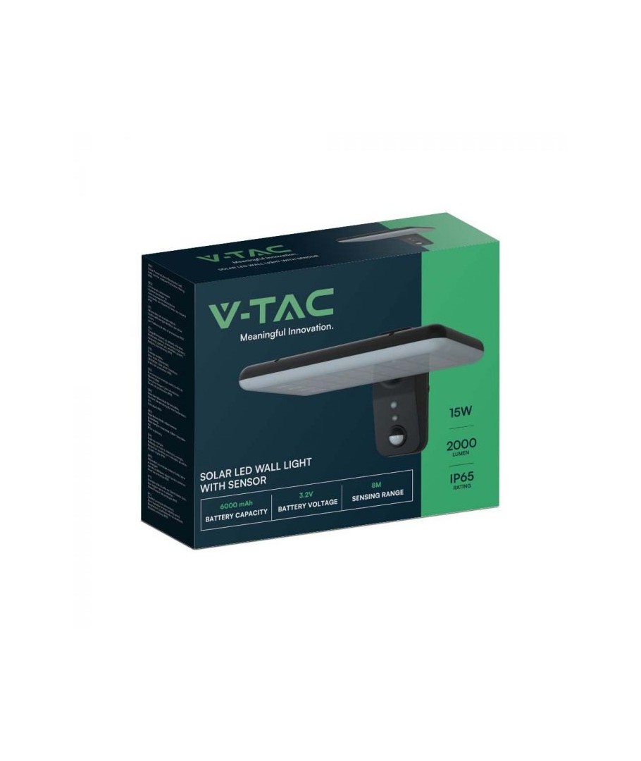 Oppgrader uteområdet ditt med V-Tac 15W LED Solar vegglampe. Denne sorte vegglampen er utstyrt med sensor og har høy beskyttelsesgrad IP65, som gjør den egnet for utendørs bruk.