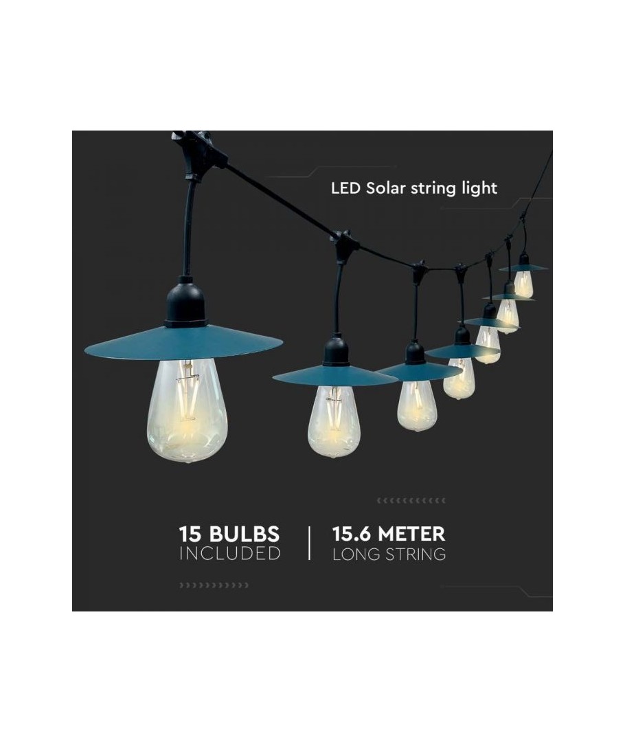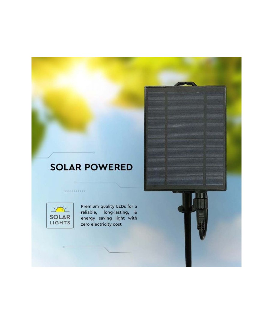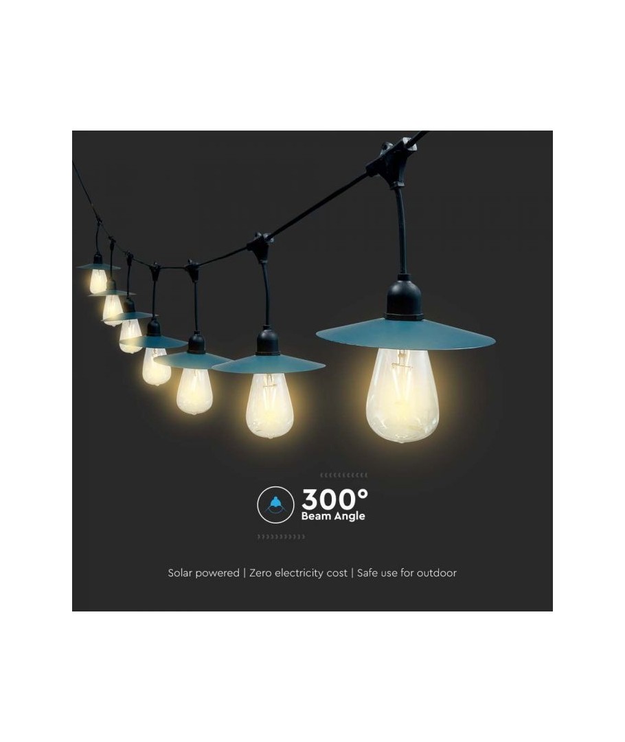 Med V-Tac Solar lyskjede kan du forvandle enhver uteplass til et innbydende og stemningsfullt område. Denne lyskjeden gir en lysstyrke på 50 lumen og tilbyr en høy lysspredning på 300 grader, noe som sikrer en jevn fordeling av lys som dekker hele området. Lysets varme hvite fargetone (3000K) bidrar til å skape en koselig og avslappende atmosfære, ideelt for kvelder på terrassen eller i hagen.