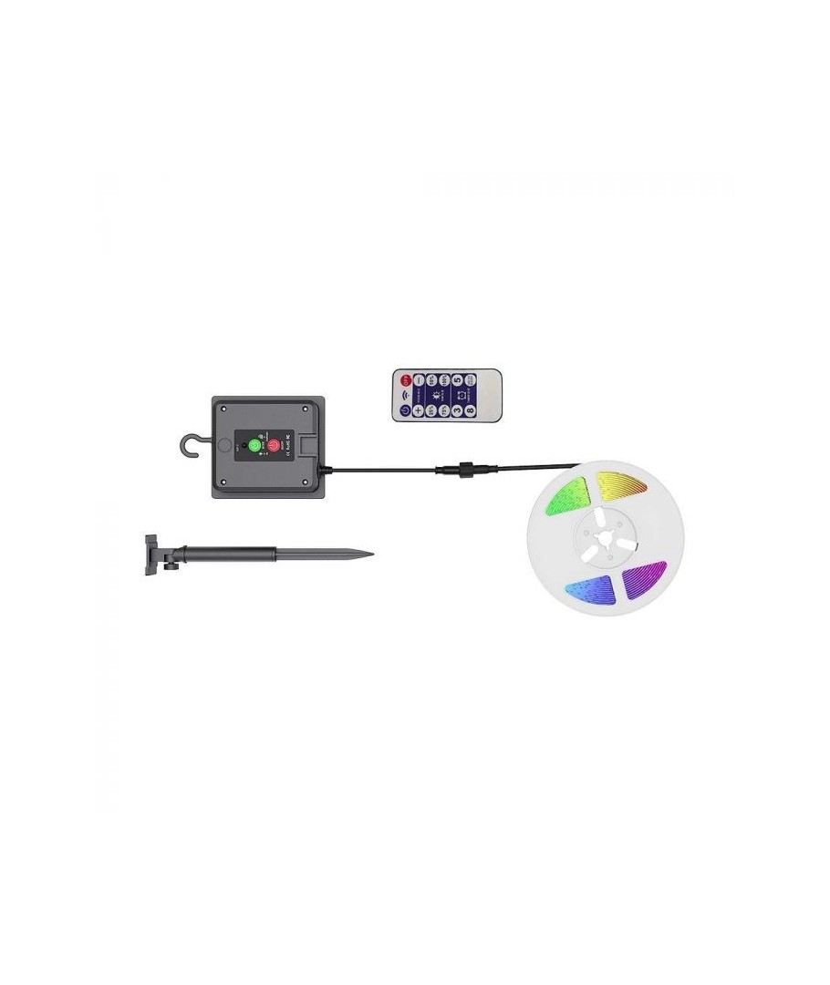 RGB-stripen er den perfekte løsningen for å skape atmosfærisk belysning utendørs. Den 5 meter lange LED-stripen er utstyrt med RGB fargeendring, som kan styres med den medfølgende fjernkontrollen. Solcellepanelet kan enkelt monteres via spyd eller henges opp, noe som gjør det enkelt å plassere det på ønsket sted. Den IP67-sertifiserte stripen er vanntett og egnet for utendørs bruk. Med denne LED-solcellestripen kan du skape en fantastisk atmosfære og forvandle hagen eller terrassen din til et lyst og fargerikt rom.