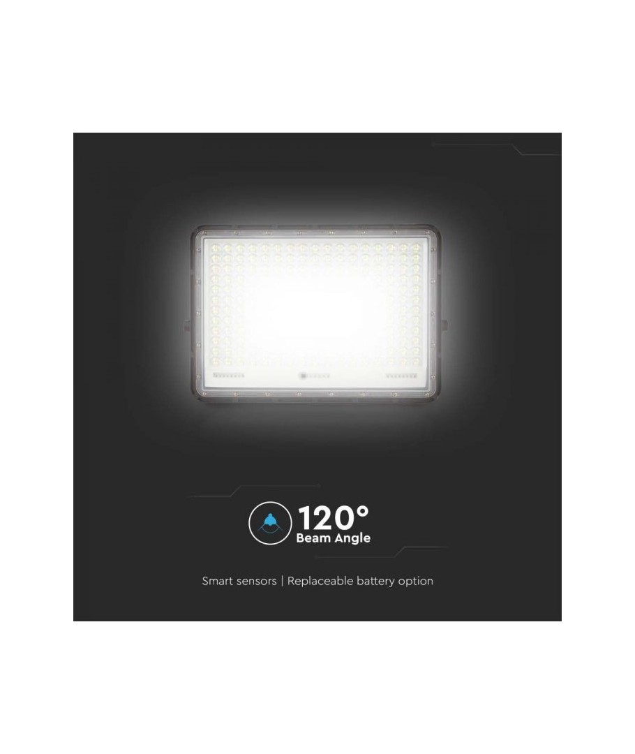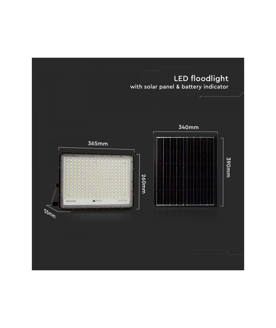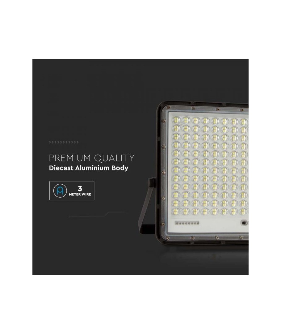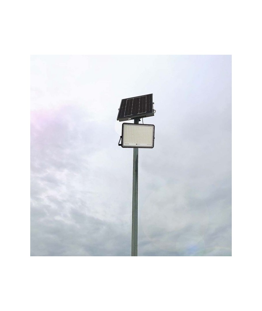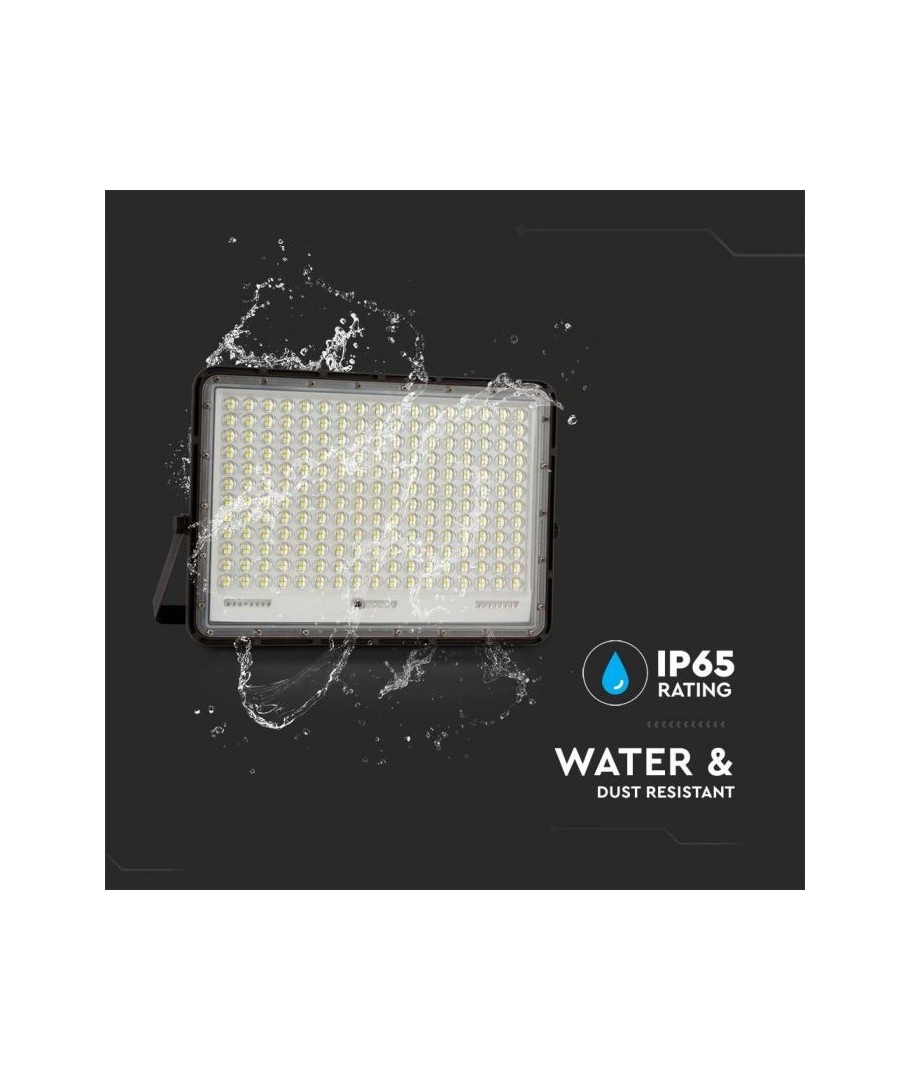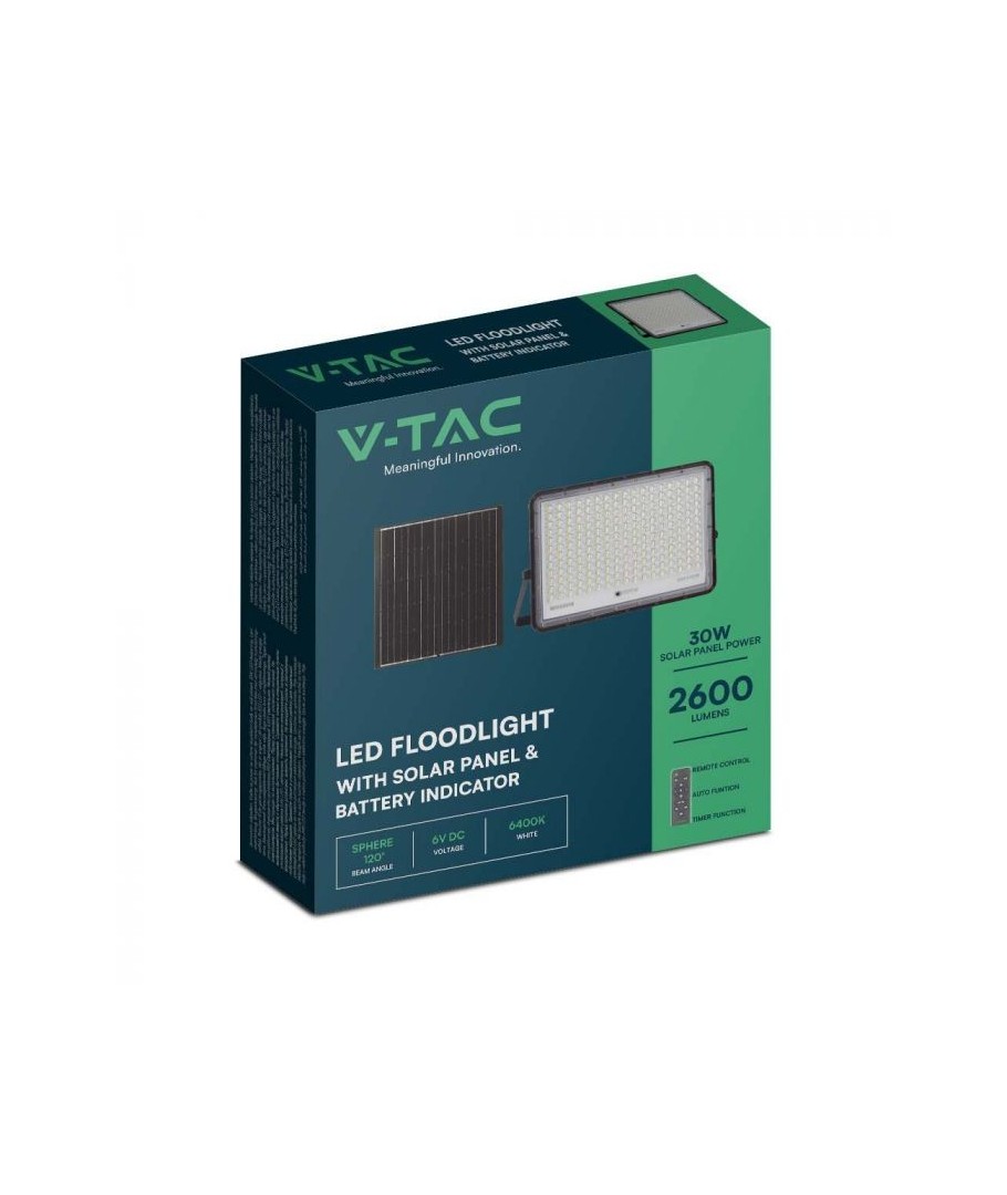 V-Tac 30W LED Solar flomlys - Sort, en praktisk og energieffektiv løsning for utendørs belysning. Denne lyskasteren inkluderer en solcelle og fjernkontroll og er designet for å tåle alle værforhold med sin IP65-klassifisering. Den har også en hendig timerfunksjon som lar deg stille den til å slå seg av automatisk etter en viss tidsperiode. Med en full ladetid på kun 4-6 timer kan denne projektoren gi 12 timer lys. Den kommer også med en 3 meter lang ledning som gir deg fleksibiliteten til å plassere den der du trenger den.