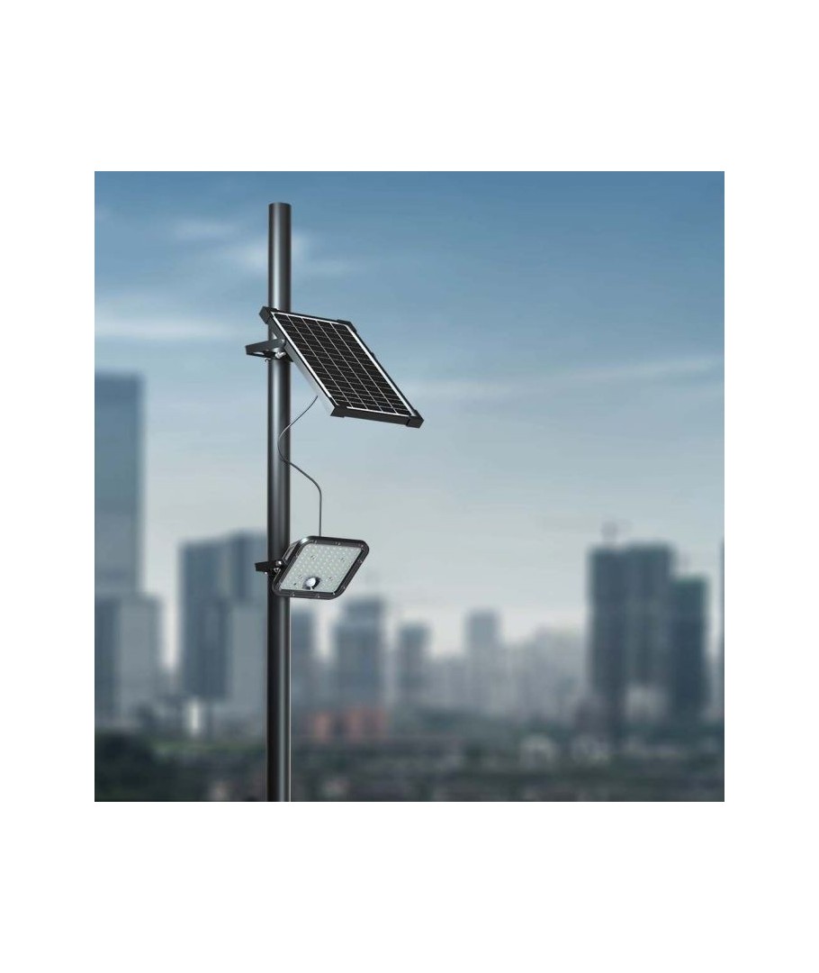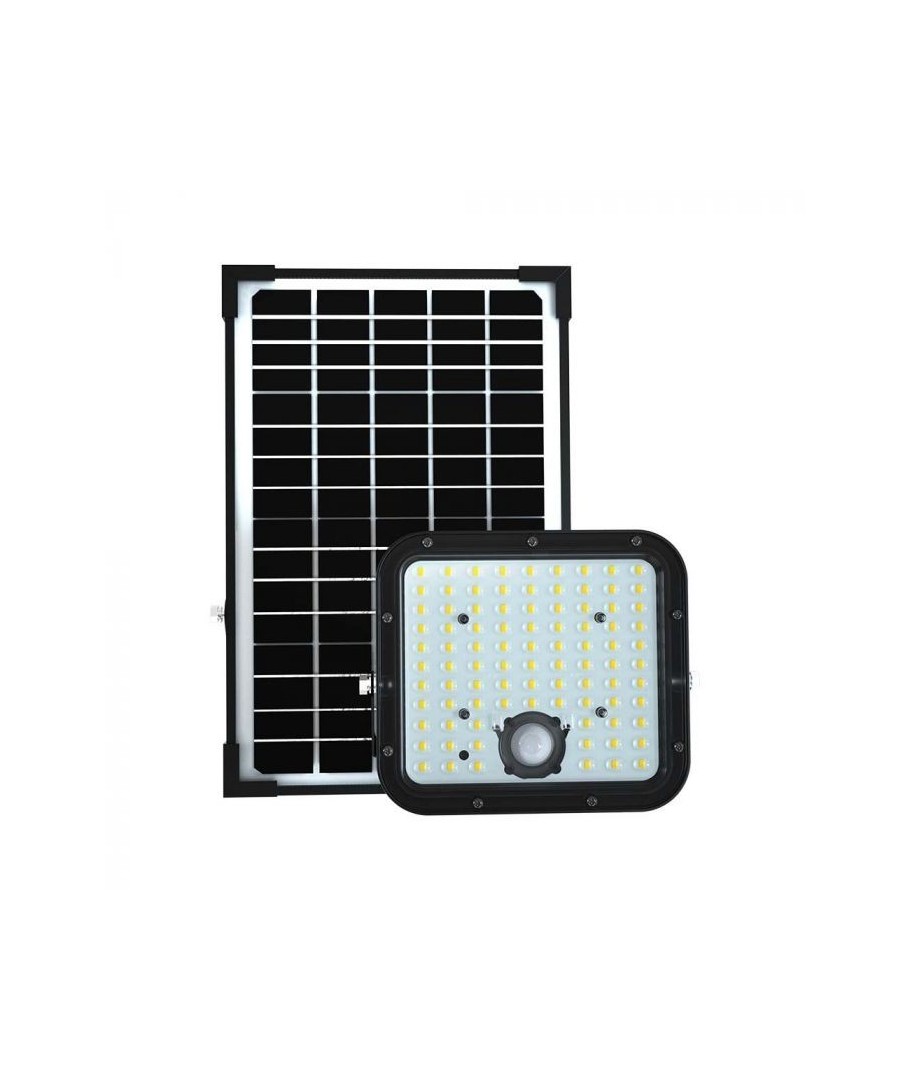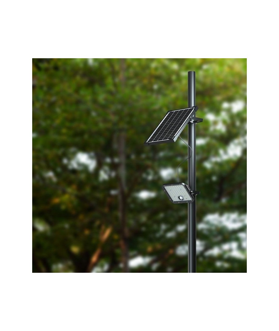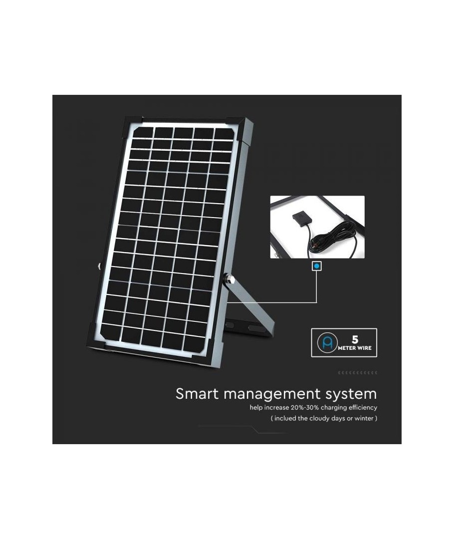 V-Tac 30W LED Solar flomlys - Sort, en praktisk og energieffektiv løsning for utendørs belysning. Denne lyskasteren inkluderer en solcelle og fjernkontroll og er designet for å tåle alle værforhold med sin IP65-klassifisering. Den har også en hendig timerfunksjon som lar deg sette den til å slå seg av automatisk etter en viss tidsperiode. Med en full ladetid på kun 4-6 timer kan denne projektoren gi 60 timer lys. Den kommer også med en ledning, som gir deg fleksibiliteten til å plassere den der du trenger den.