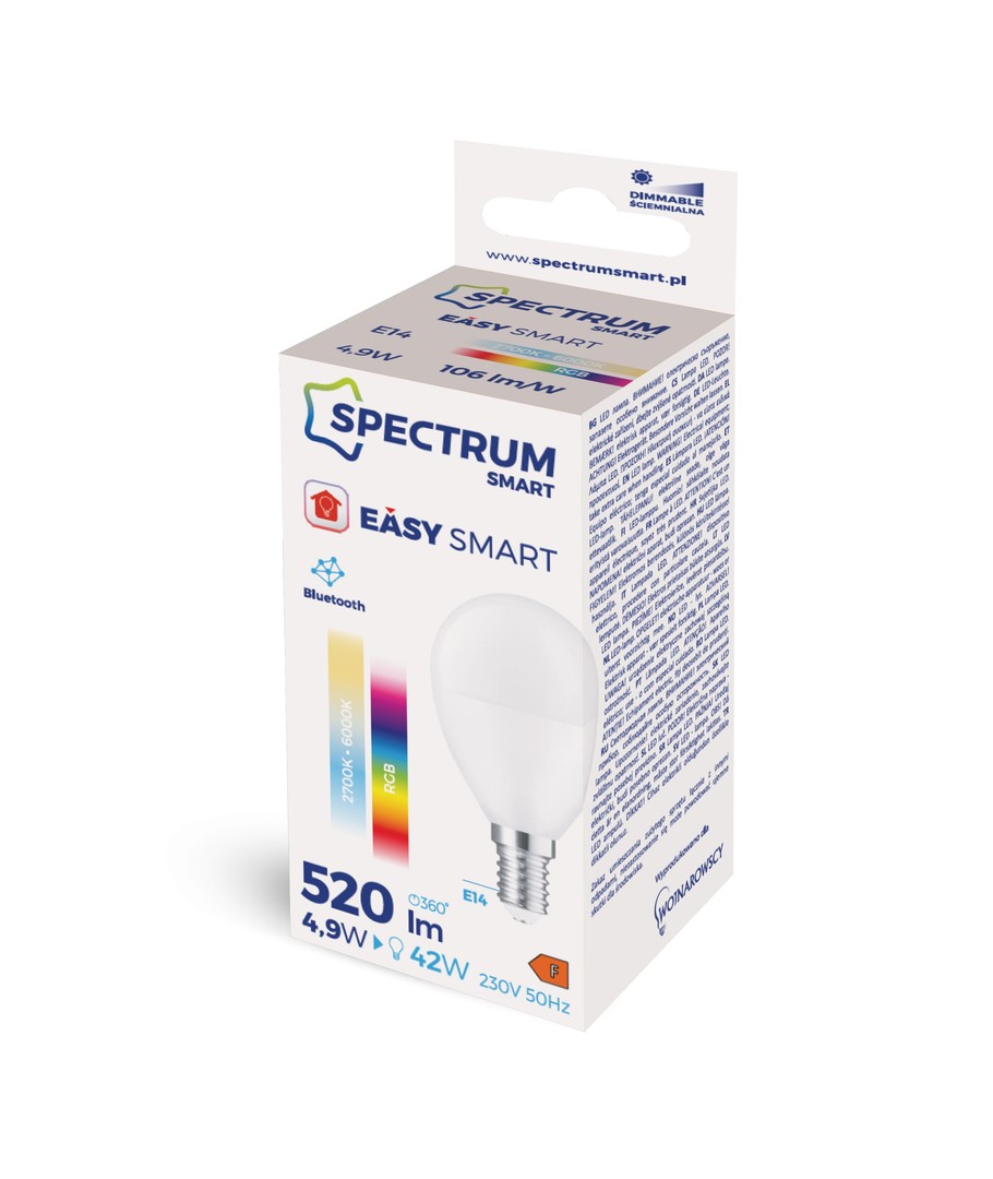 LED P45 4,9W E14 er en del av Spectrum Smart Easy Smart-serien, designet for å integreres sømløst i smarthus-systemer. Denne pæren kan styres og dimmes enkelt via kompatible smarthus-løsninger, noe som gir deg kontroll over belysningen på en helt ny måte. Merk at den ikke kan dimmes med tradisjonelle veggdimmere.
