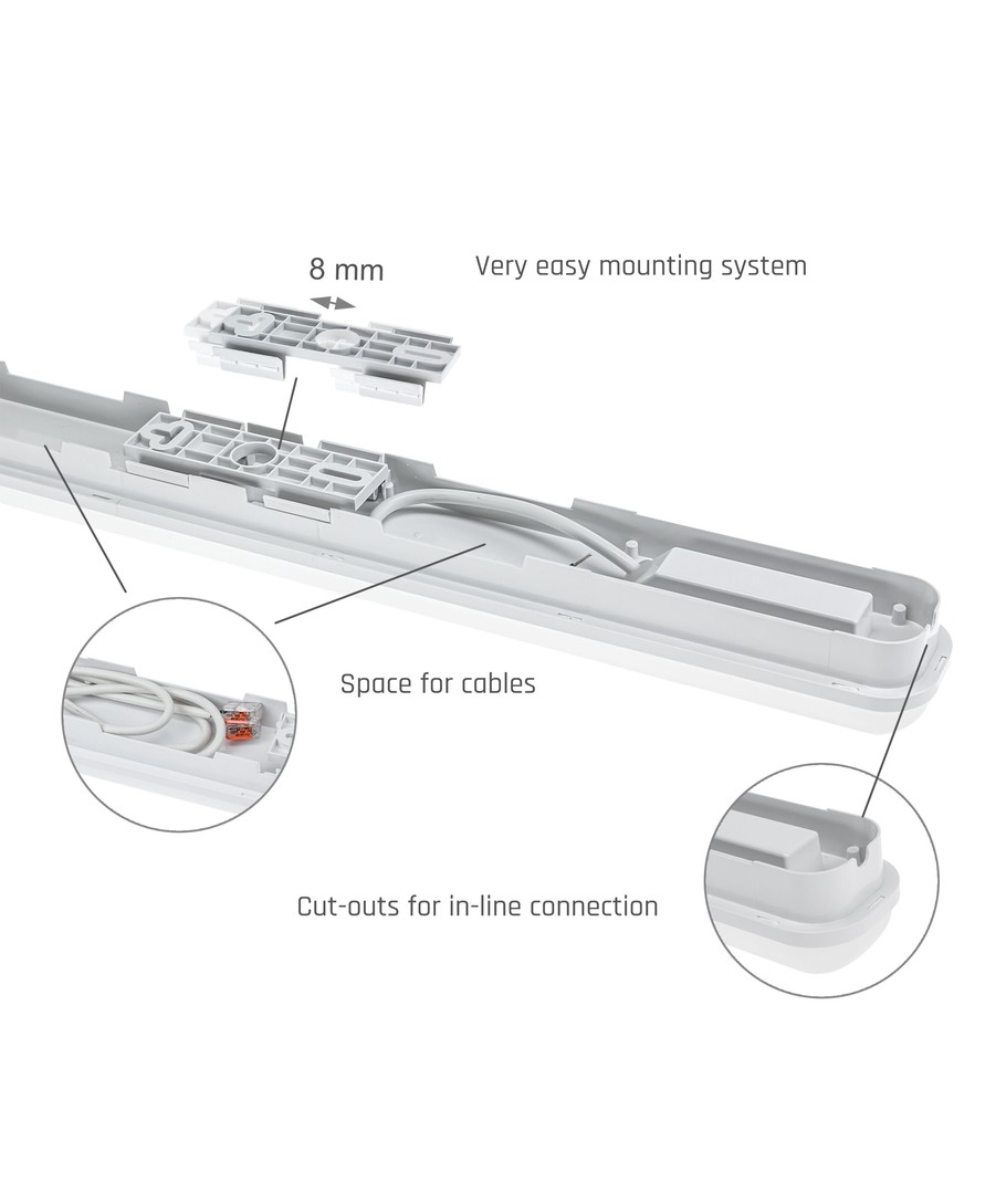Lampen måler 600 x 60 x 52 mm og passer lett inn i trange rom eller steder hvor det er behov for en kompakt, men effektiv belysningsløsning. Med et elegant hvitt design, vil denne lampen passe inn i de fleste miljøer og tilføre et moderne preg.