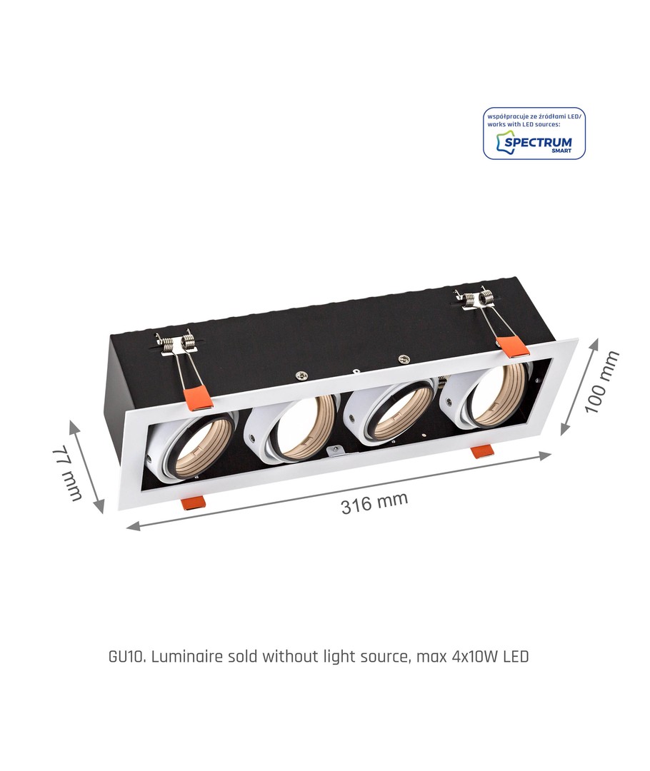 Lampen er konstruert for å oppfylle høye krav til både utseende og belysningsevne. Med en total størrelse på 316 x 77 x 100 mm, passer den perfekt inn i moderne interiører som krever diskrete, men effektive lysløsninger. For å installere denne lampen, kreves det en hul størrelse på 92 x 305 mm, noe som gjør den godt egnet for innfelt belysning.