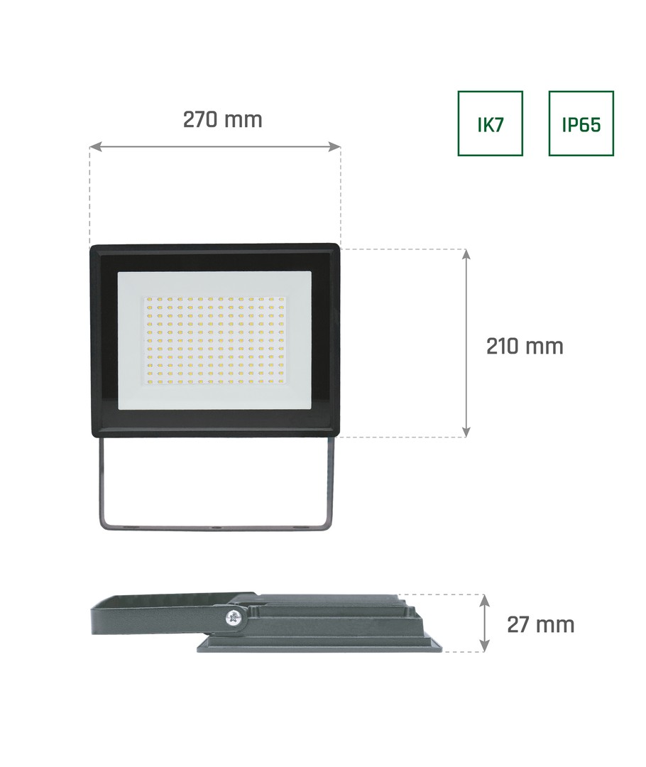Den slanke og kompakte designen, med mål på 270 x 27 x 210 mm, gjør det enkelt å plassere lyskasteren akkurat der du trenger den. Laget med en robust konstruksjon, har den en IP65 beskyttelsesgrad som sikrer motstandsdyktighet mot vannsprut og regn, og gjør den ideell for utendørs bruk.