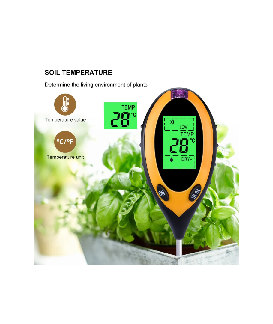 Opplev presisjon og allsidighet med vår 4 i 1 måler, som forenkler pleien av plantene dine ved å måle pH, fuktighet, temperatur og lysintensitet i én kompakt enhet.
