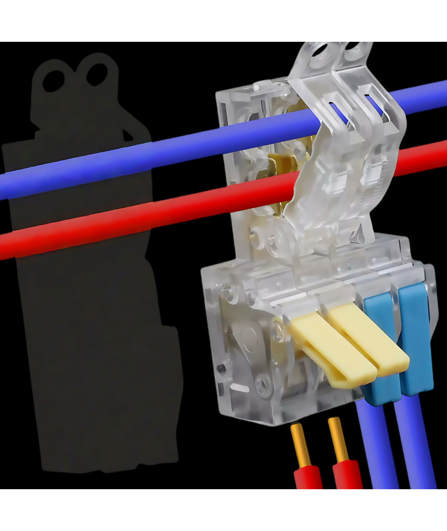 De har et praktisk tilkoblingssystem, med oransje vippearm, som gjør det enkelt å få de myke lederne inn i hullene.