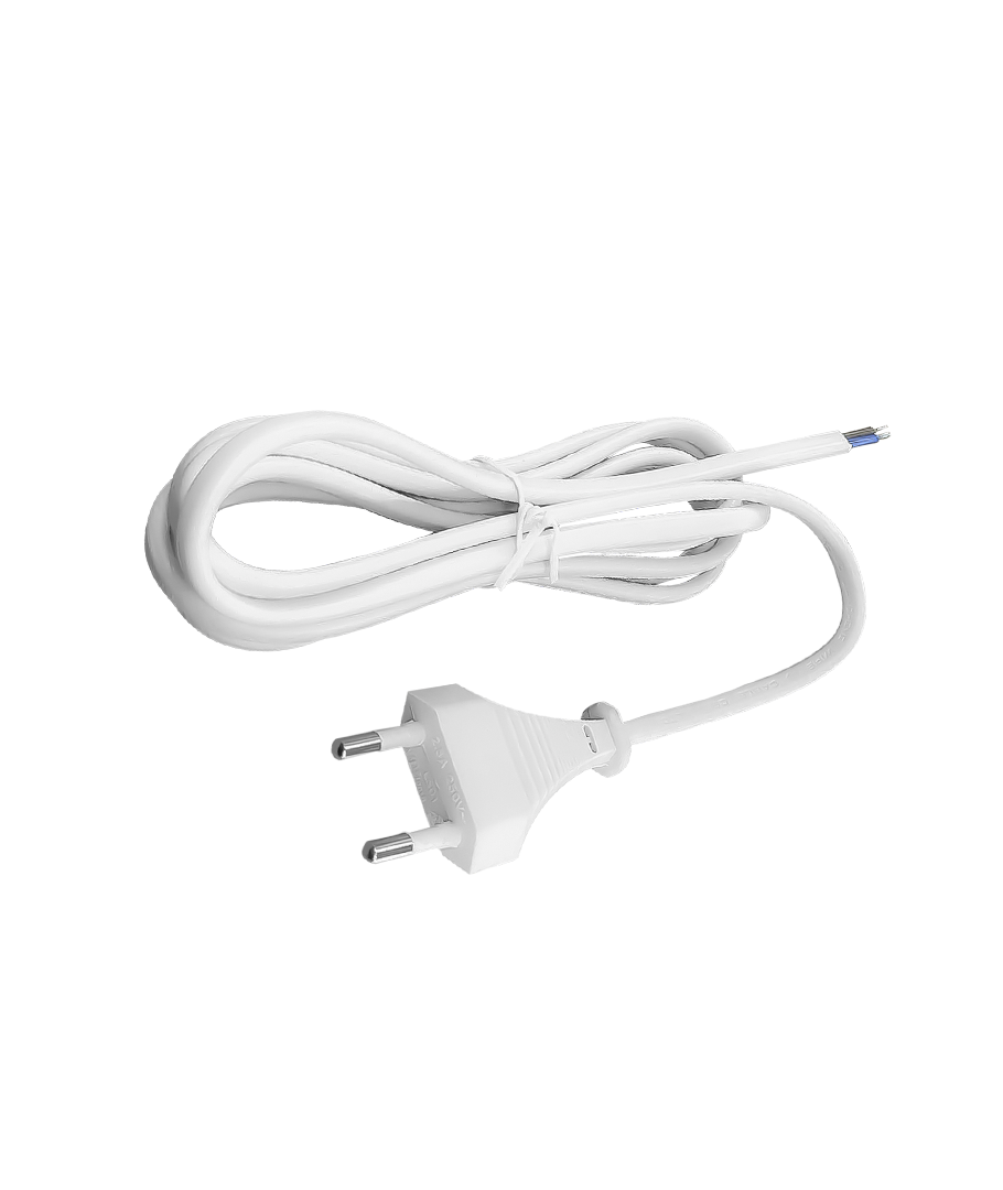 1,5 meter hvit strømkabel med euro plugg og avisolerte ledninger.