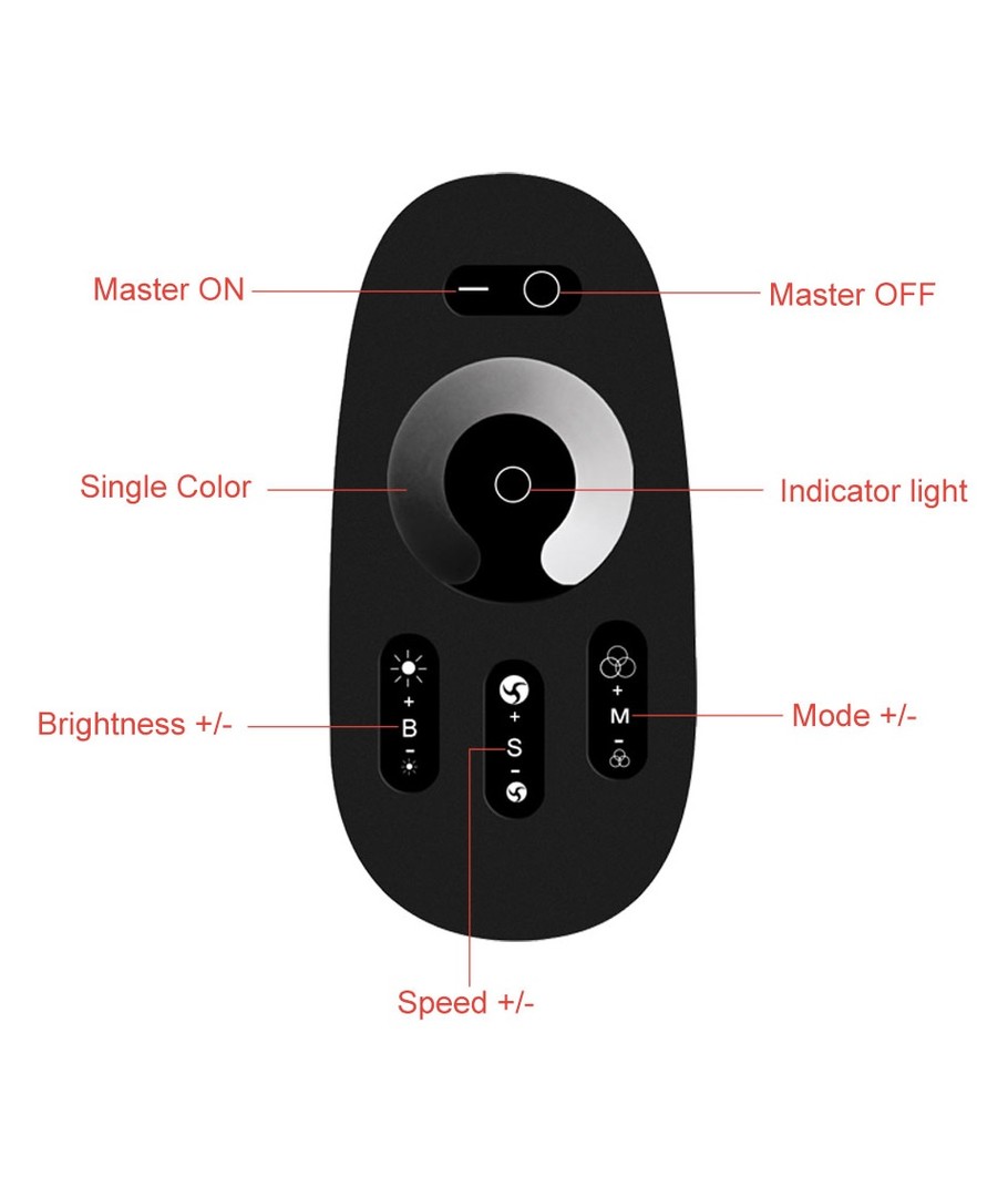 Dette settet styres via den medfølgende fjernkontrollen, hvor det er mulig å stille inn lysstyrken på lyset og velge om lyset skal være på eller av.