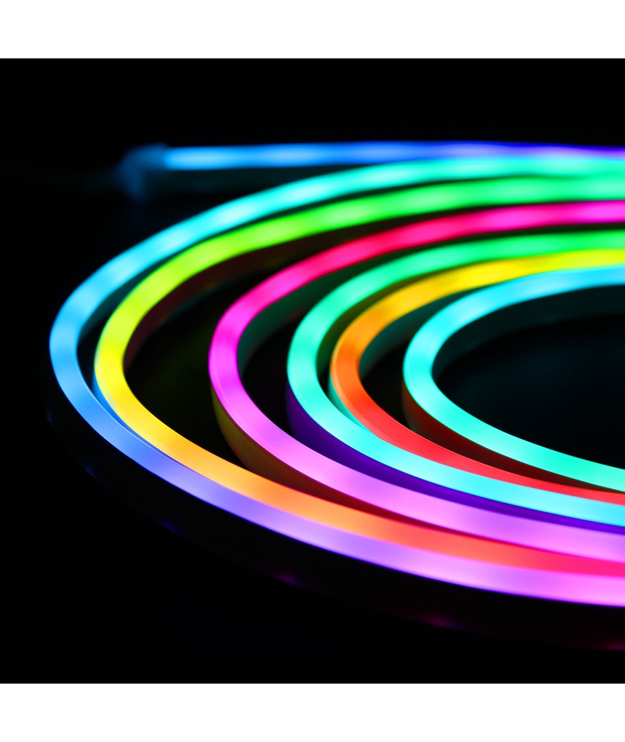 Opplev en verden av farger med vår 3W/m RGBIC 7x15 Neon Flex strip - en 250cm RGBIC neon flex, som bringer lys og liv til ethvert rom med sitt dynamiske fargespill og fleksible design.