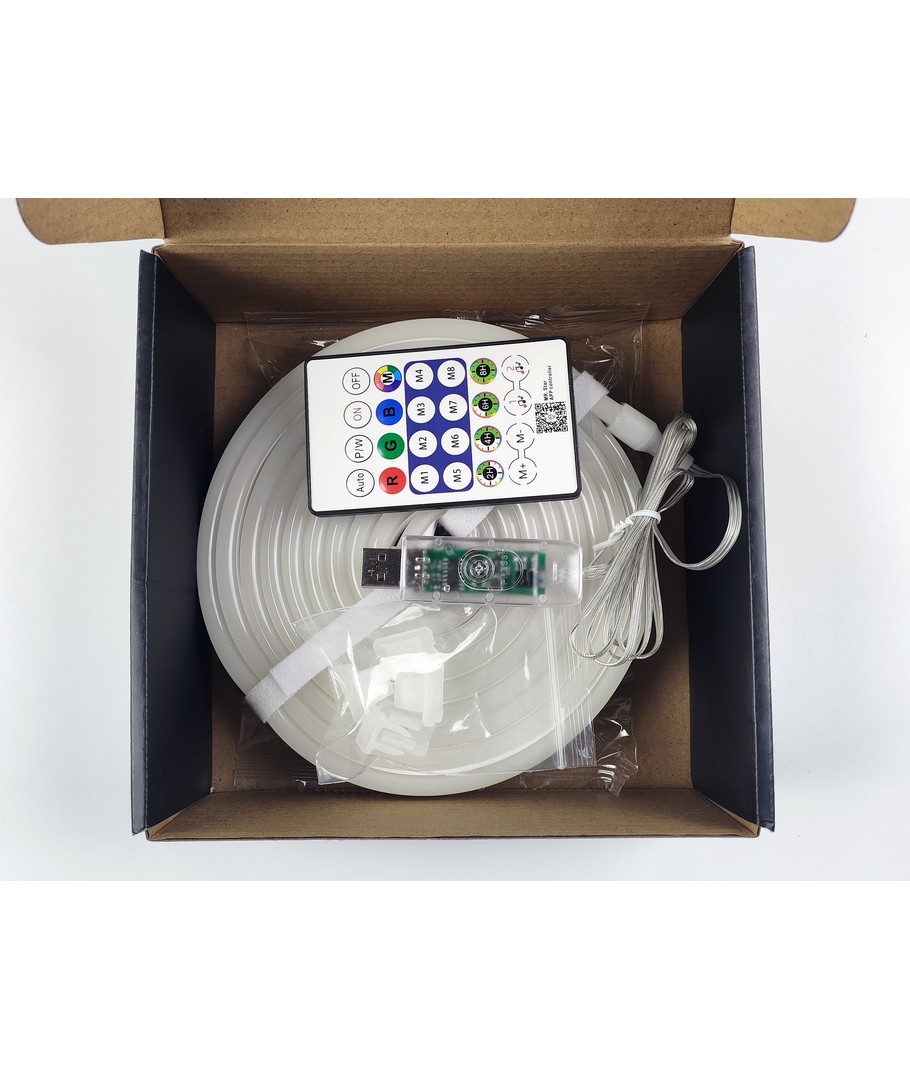 - 5m RGBIC Neon flex slange, komplett sett - Vevd tau, Bluetooth App, fjernkontroll, USB