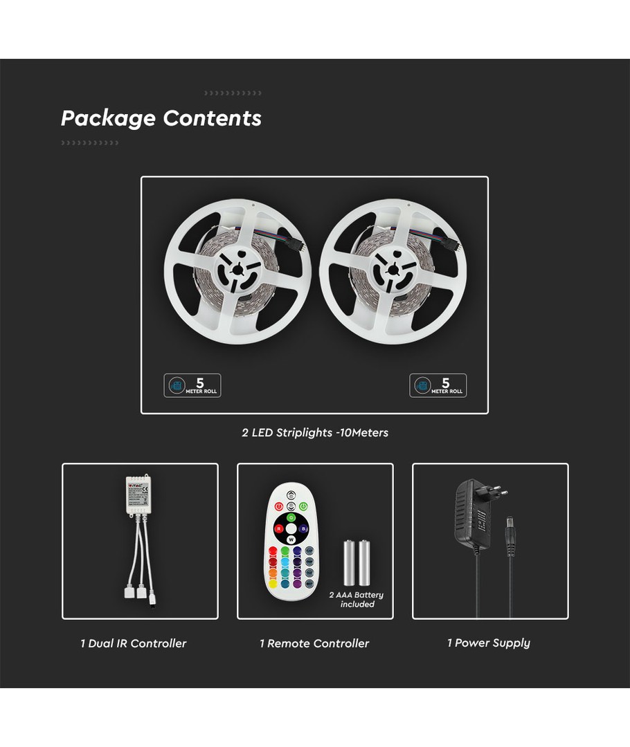 Opplev et komplett lysopplevelsessett med vårt 10m (2x5m) RGB strip sett, som inkluderer både fjernkontroll og strømforsyning, ideelt for å skape stemningsfulle belysninger i hjemmet.