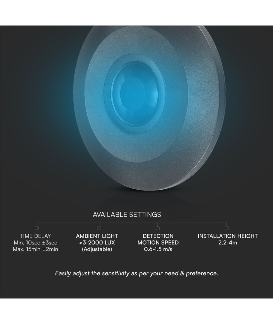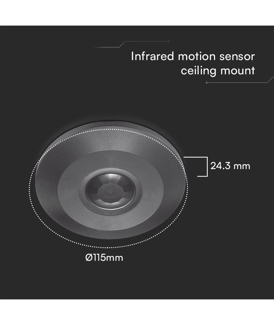 Den elegante PIR taksensor i helt svart fra V-Tac tilbyr en avansert 360 graders deteksjon, som er ideell for sikkerhet og energieffektivitet i hjemmet eller på kontoret.