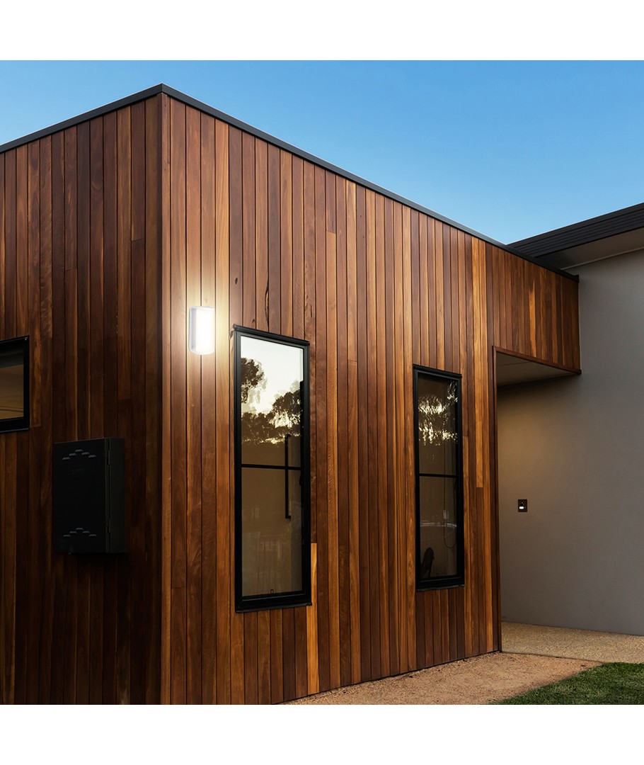 Dimensjonene på lampen er 203 x 92.5 x 129 mm, noe som gjør den til en diskret og stilren løsning for veggmontering. Den robuste konstruktionen med IP65-klassifisering betyr at denne lampen kan brukes utendørs, og den er motstandsdyktig mot vannsprut og regn, perfekt for nordiske værforhold.