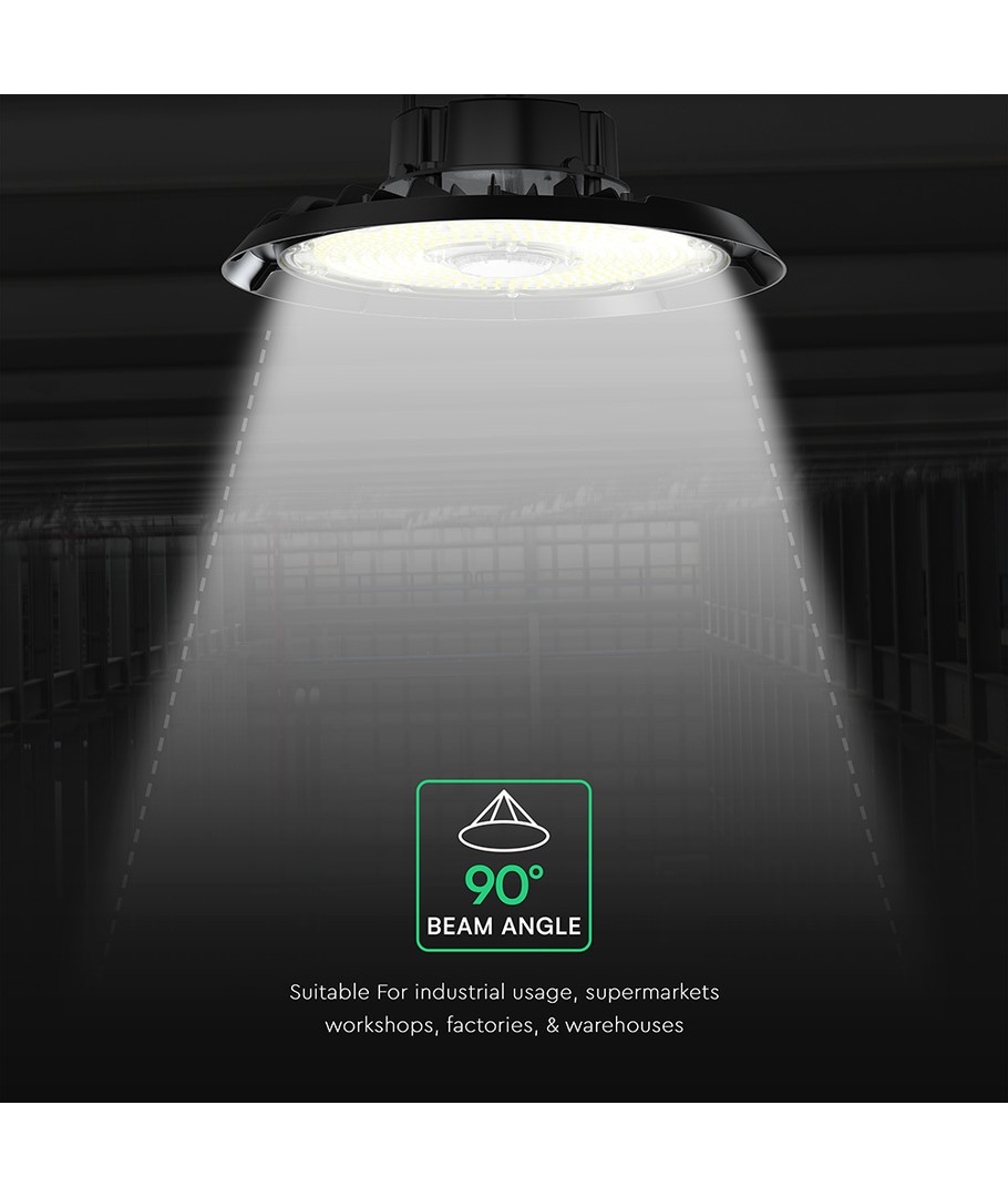 VT-91202 LED highbay er en kraftfull og pålitelig belysningsløsning for industrielle miljøer.- Effektivitet: Yter 135 lumen per watt, noe som sikrer høy lysutbytte.