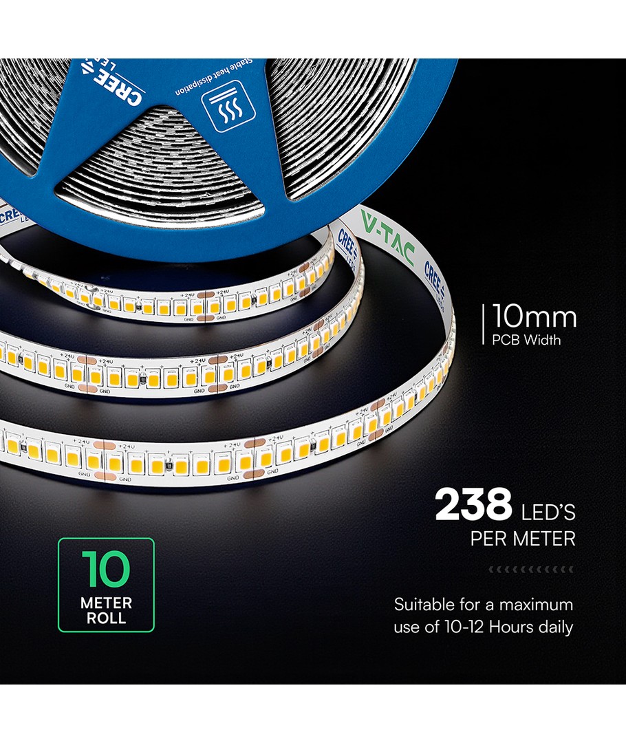 238 VT-2835 LED-lysliste 18W/m 24V - Cree-chip, 4000K, IP20, 10mm, dobbel PCB, 10m/rull, pris/m Utvid