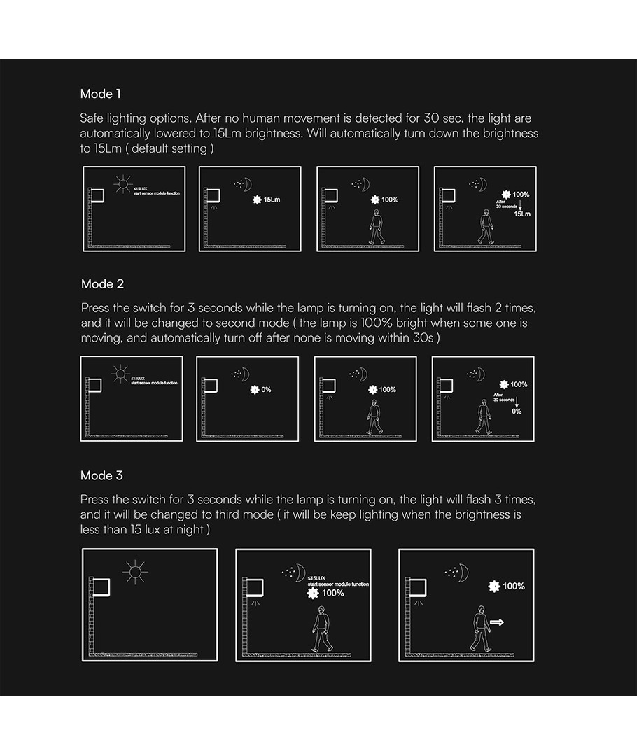 - PIR-sensor: Integrert sensor med 120° vinkel som registrerer bevegelse og tenner lyset automatisk.
