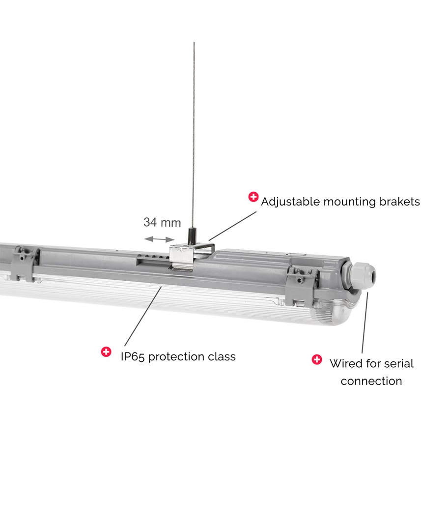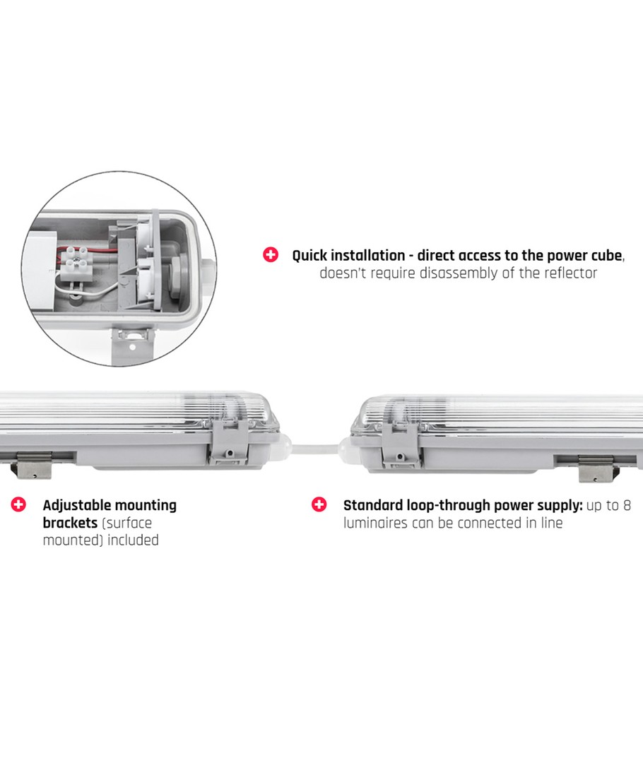 Konstruert for enkel installasjon, vår LED-armatur tillater gjennomgangskobling som forenkler oppsettet i større områder. Armaturen kobles enkelt til en vanlig 230V forsyning, noe som gjør den kompatibel med standard elektriske systemer.