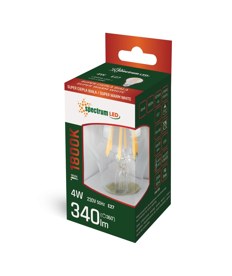 Opplev den nostalgiske sjarmen av gammeldagse glødetrådpærer kombinert med moderne LED-teknologi med Spectrum 4W LED Pære, A60. Denne pæren er designet med karbon filamenter som gir en autentisk glød, og bader omgivelsene i en ekstra varm hvit nyanse.