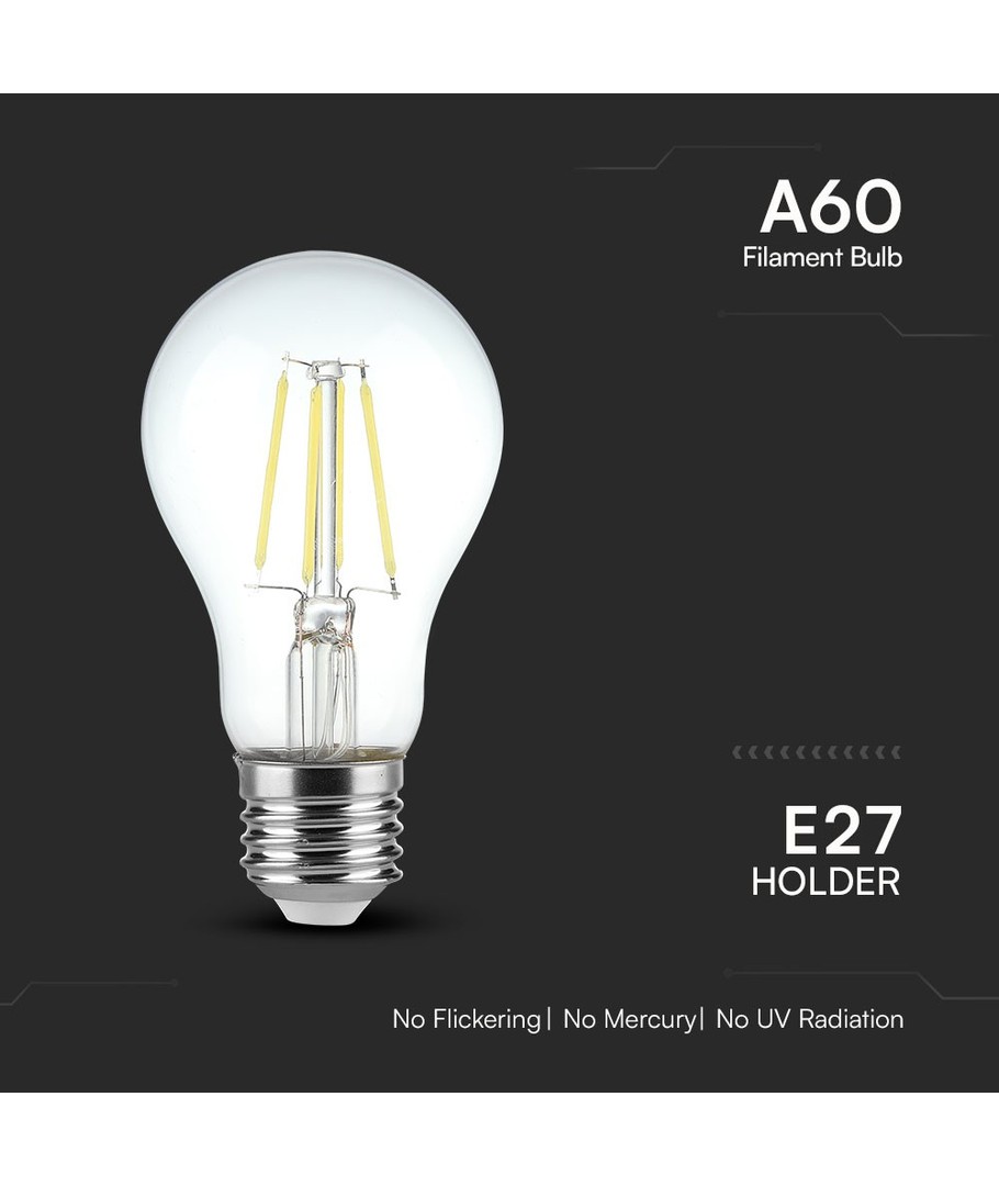 V-Tac Kulltrådspære 4W E27 - 6500K, A60 er den ideelle belysningsløsningen for de som søker både energiøkonomi og stilfullt design.