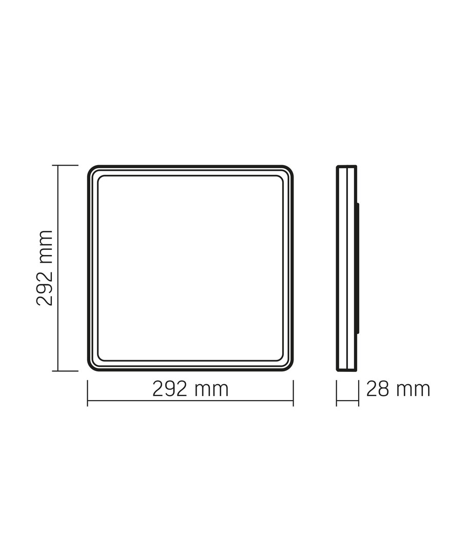 Lampens dimensjoner er 292 x 292 x 28 mm, og den er designet for å være kompakt og plassbesparende. Selv om den har en IP20-klassifisering og dermed ikke er vannbestandig, er denne taklampen ideell for innendørs bruk hvor det ikke er vann i nærheten.